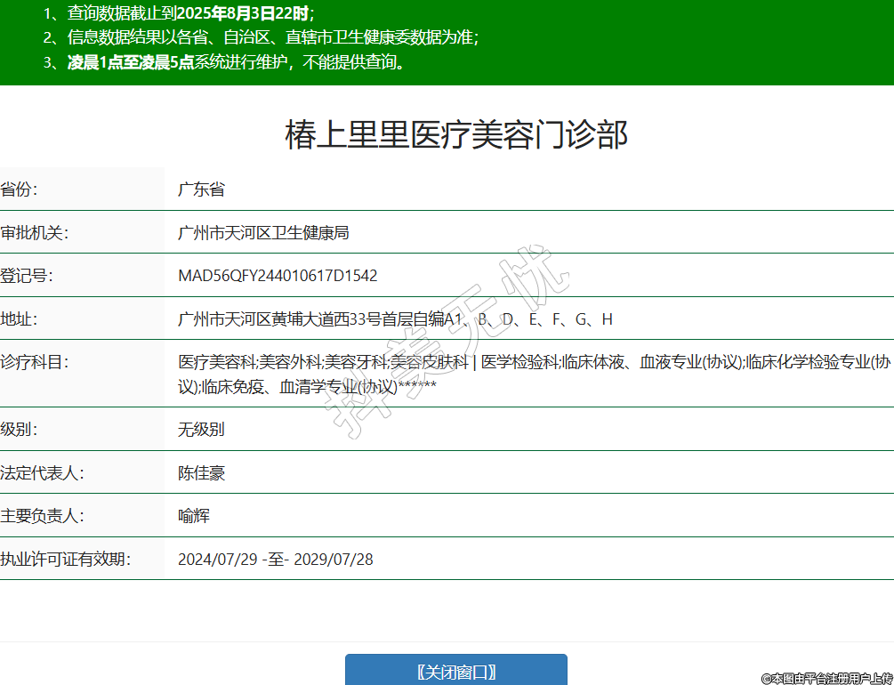 省份:廣東省審批機關(guān):廣州市天河區(qū)衛(wèi)生健康局登記號:MAD56QFY244010617D1542地址:廣州市天河區(qū)黃埔大道西33號首層自編A1、B、D、E、F、G、H診療科目:醫(yī)療美容科;美容外科;美容牙科;美容皮膚科 | 醫(yī)學(xué)檢驗科;臨床體液、血液專業(yè)(協(xié)議);臨床化學(xué)檢驗專業(yè)(協(xié)議);臨床免疫、血清學(xué)專業(yè)(協(xié)議)******級別:無級別法定代表人:陳佳豪主要負責(zé)人:喻輝執(zhí)業(yè)許可證有效期:2024/07/29 -至- 2029/07/28 -