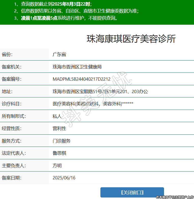 省份:廣東省備案機(jī)關(guān):珠海市香洲區(qū)衛(wèi)生健康局備案編號(hào):MADPML5B244040217D2212地址:珠海市香洲區(qū)寶順路51號(hào)2棟1單元201、203辦公診療科目:醫(yī)療美容科(美容皮膚科,美容外科)******所有制形式:私人經(jīng)營(yíng)性質(zhì):營(yíng)利性服務(wù)方式:門診服務(wù)法定代表人:魯思棋主要負(fù)責(zé)人:方明備案日期:2025/06/16 -