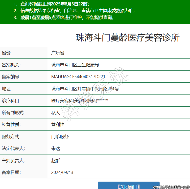 珠海斗門蔓齡醫(yī)療美容診所,診療科目:醫(yī)療美容科(美容皮膚科)******