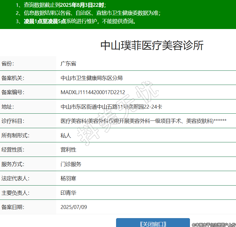 省份:廣東省備案機(jī)關(guān):中山市衛(wèi)生健康局東區(qū)分局備案編號:MADXLJ11144200017D2212地址:中山市東區(qū)街道中山五路11號奕翠園22-24卡診療科目:醫(yī)療美容科(美容外科僅限開展美容外科一級項目手術(shù)、美容皮膚科)******所有制形式:私人經(jīng)營性質(zhì):營利性服務(wù)方式:門診服務(wù)法定代表人:楊羽寒主要負(fù)責(zé)人:印青華備案日期:2025/07/09 -