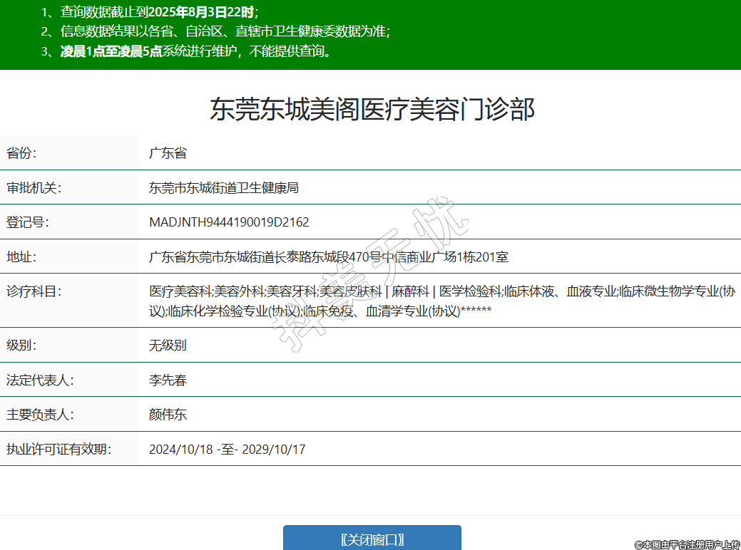 省份:廣東省審批機(jī)關(guān):東莞市東城街道衛(wèi)生健康局登記號(hào):MADJNTH9444190019D2162地址:廣東省東莞市東城街道長(zhǎng)泰路東城段470號(hào)中信商業(yè)廣場(chǎng)1棟201室診療科目:醫(yī)療美容科;美容外科;美容牙科;美容皮膚科 | 麻醉科 | 醫(yī)學(xué)檢驗(yàn)科;臨床體液、血液專業(yè);臨床微生物學(xué)專業(yè)(協(xié)議);臨床化學(xué)檢驗(yàn)專業(yè)(協(xié)議);臨床免疫、血清學(xué)專業(yè)(協(xié)議)******級(jí)別:無(wú)級(jí)別法定代表人:李先春主要負(fù)責(zé)人:顏偉東執(zhí)業(yè)許可證有效期:2024/10/18 -至- 2029/10/17 -