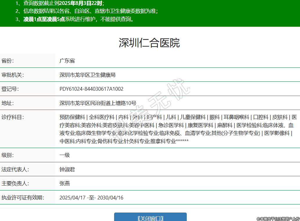 省份:廣東省審批機(jī)關(guān):深圳市龍華區(qū)衛(wèi)生健康局登記號:PDY61024-844030617A1002地址:深圳市龍華區(qū)民治街道上塘路10號診療科目:預(yù)防保健科 | 全科醫(yī)療科 | 內(nèi)科 | 外科 | 婦產(chǎn)科 | 兒科 | 兒童保健科 | 眼科 | 耳鼻咽喉科 | 口腔科 | 皮膚科 | 醫(yī)療美容科;美容外科;美容皮膚科;美容中醫(yī)科 | 急診醫(yī)學(xué)科 | 康復(fù)醫(yī)學(xué)科 | 麻醉科 | 醫(yī)學(xué)檢驗科;臨床體液、血液專業(yè);臨床微生物學(xué)專業(yè);臨床化學(xué)檢驗專業(yè);臨床免疫、血清學(xué)專業(yè);其他(分子生物學(xué)專業(yè)) | 醫(yī)學(xué)影像科 | 中醫(yī)科;內(nèi)科專業(yè);骨傷科專業(yè);針灸科專業(yè);推拿科專業(yè)******級別:一級法定代表人:鐘淑君主要負(fù)責(zé)人:張燕執(zhí)業(yè)許可證有效期:2025/04/17 -至- 2030/04/16 -