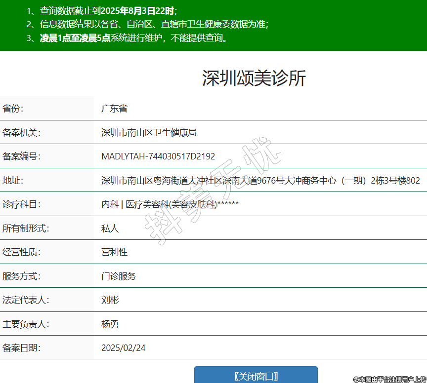 省份:廣東省備案機(jī)關(guān):深圳市南山區(qū)衛(wèi)生健康局備案編號(hào):MADLYTAH-744030517D2192地址:深圳市南山區(qū)粵海街道大沖社區(qū)深南大道9676號(hào)大沖商務(wù)中心(一期)2棟3號(hào)樓802診療科目:內(nèi)科 | 醫(yī)療美容科(美容皮膚科)******所有制形式:私人經(jīng)營(yíng)性質(zhì):營(yíng)利性服務(wù)方式:門(mén)診服務(wù)法定代表人:劉彬主要負(fù)責(zé)人:楊勇備案日期:2025/02/24 -