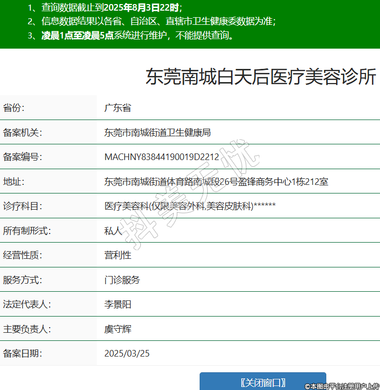 省份:廣東省備案機(jī)關(guān):東莞市南城街道衛(wèi)生健康局備案編號:MACHNY83844190019D2212地址:東莞市南城街道體育路南城段26號盈鋒商務(wù)中心1棟212室診療科目:醫(yī)療美容科(僅限美容外科,美容皮膚科)******所有制形式:私人經(jīng)營性質(zhì):營利性服務(wù)方式:門診服務(wù)法定代表人:李景陽主要負(fù)責(zé)人:虞守輝備案日期:2025/03/25 -
