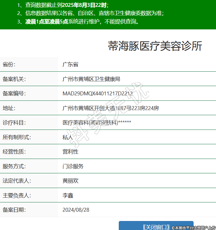 省份:廣東省備案機(jī)關(guān):廣州市黃埔區(qū)衛(wèi)生健康局備案編號(hào):MAD29DMQX44011217D2212地址:廣州市黃埔區(qū)開(kāi)創(chuàng)大道1887號(hào)223房224房診療科目:醫(yī)療美容科(美容皮膚科)******所有制形式:私人經(jīng)營(yíng)性質(zhì):營(yíng)利性服務(wù)方式:門(mén)診服務(wù)法定代表人:黃麗歡主要負(fù)責(zé)人:李鑫備案日期:2024/08/28 -