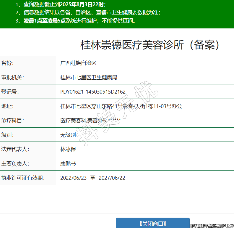 省份:廣西壯族自治區(qū)審批機關(guān):桂林市七星區(qū)衛(wèi)生健康局登記號:PDY01621-145030515D2162地址:桂林市七星區(qū)穿山東路41號彰泰?天街1棟11-03號辦公診療科目:醫(yī)療美容科;美容外科******級別:無級別法定代表人:林冰保主要負(fù)責(zé)人:廖鵬書執(zhí)業(yè)許可證有效期:2022/06/23 -至- 2027/06/22 -