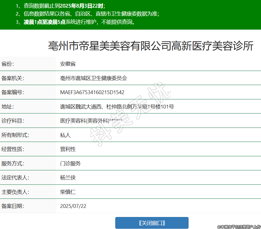 省份:安徽省備案機(jī)關(guān):亳州市譙城區(qū)衛(wèi)生健康委員會(huì)備案編號(hào):MAEF3A67534160215D1542地址:譙城區(qū)魏武大道西、杜仲路北側(cè)萬(wàn)華庭1號(hào)樓101號(hào)診療科目:醫(yī)療美容科(美容外科)******所有制形式:私人經(jīng)營(yíng)性質(zhì):營(yíng)利性服務(wù)方式:門診服務(wù)法定代表人:楊蘭俠主要負(fù)責(zé)人:柴慎仁備案日期:2025/07/22 -