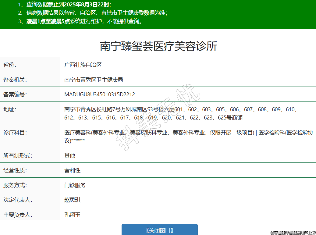 省份:廣西壯族自治區(qū)備案機關(guān):南寧市青秀區(qū)衛(wèi)生健康局備案編號:MADUGU8U345010315D2212地址:南寧市青秀區(qū)長虹路7號萬科城南區(qū)S3號樓六層601、602、603、605、606、607、608、609、610、612、613、615、616、617、618、619、620、621、622、623、625號商鋪診療科目:醫(yī)療美容科(美容外科專業(yè)、美容皮膚科專業(yè),美容外科專業(yè),僅限開展一級項目) | 醫(yī)學檢驗科(醫(yī)學檢驗協(xié)議)******所有制形式:其他經(jīng)營性質(zhì):營利性服務方式:門診服務法定代表人:趙思琪主要負責人:孔翔玉備案日期:2025/07/08 -
