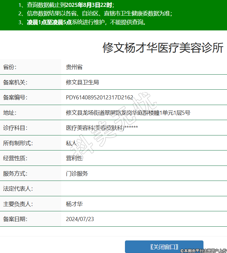 省份:貴州省備案機關(guān):修文縣衛(wèi)生局備案編號:PDY61408952012317D2162地址:修文縣龍場街道翠屏路龍崗華庭群樓幢1單元1層5號診療科目:醫(yī)療美容科(美容皮膚科)******所有制形式:私人經(jīng)營性質(zhì):營利性服務(wù)方式:門診服務(wù)法定代表人:主要負責(zé)人:楊才華備案日期:2024/07/23 -
