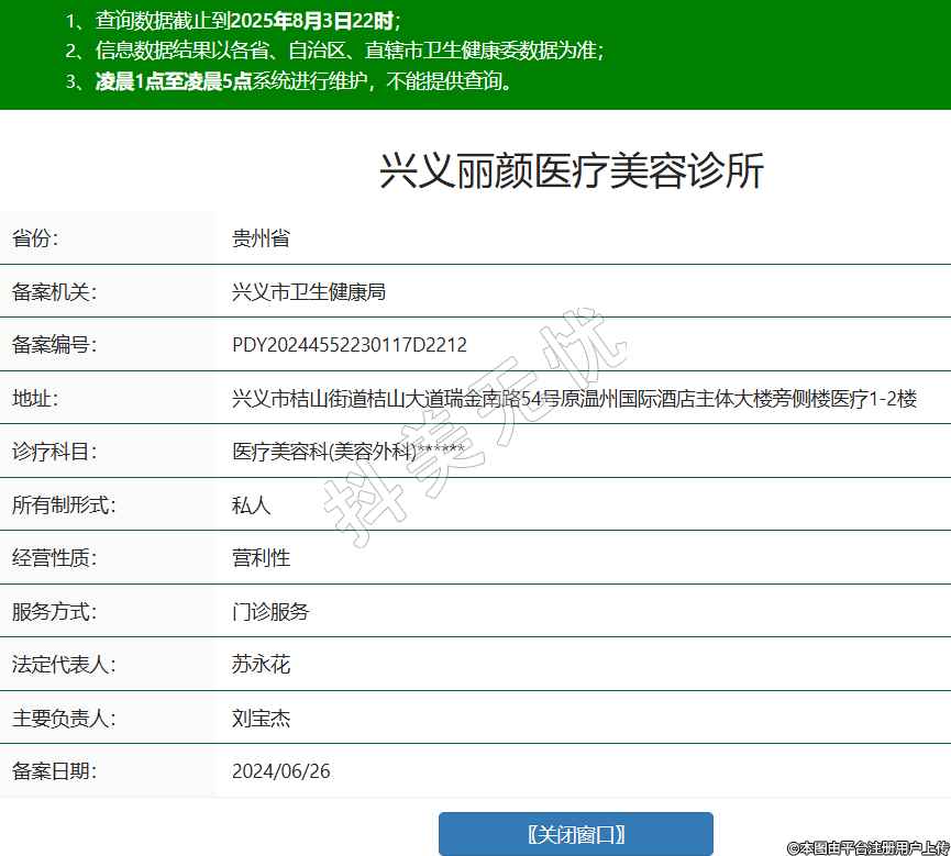 省份:貴州省備案機(jī)關(guān):興義市衛(wèi)生健康局備案編號:PDY20244552230117D2212地址:興義市桔山街道桔山大道瑞金南路54號原溫州國際酒店主體大樓旁側(cè)樓醫(yī)療1-2樓診療科目:醫(yī)療美容科(美容外科)******所有制形式:私人經(jīng)營性質(zhì):營利性服務(wù)方式:門診服務(wù)法定代表人:蘇永花主要負(fù)責(zé)人:劉寶杰備案日期:2024/06/26 -