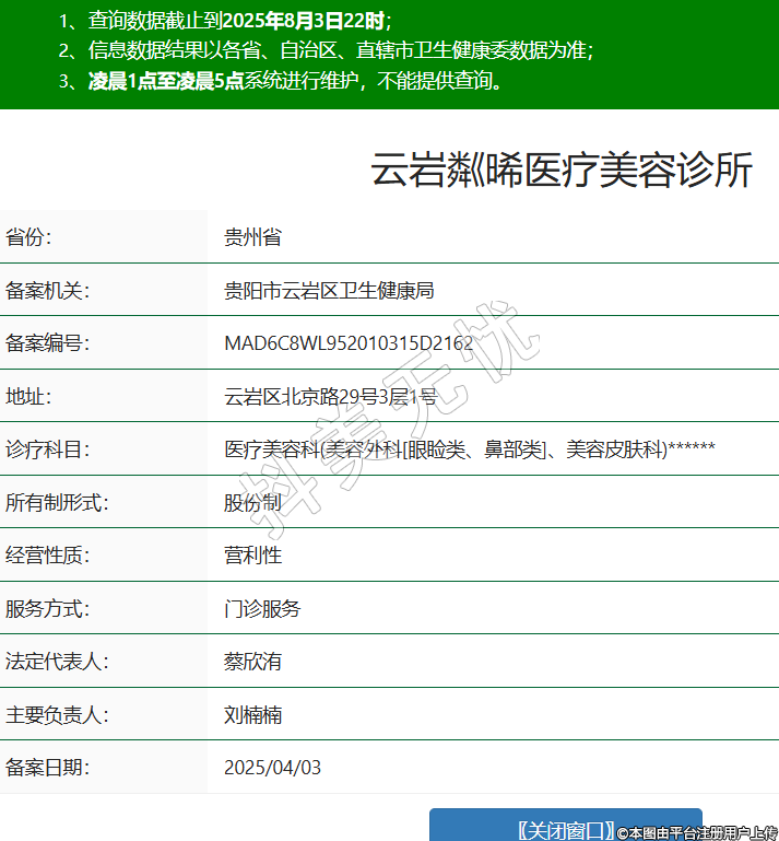 省份:貴州省備案機(jī)關(guān):貴陽市云巖區(qū)衛(wèi)生健康局備案編號(hào):MAD6C8WL952010315D2162地址:云巖區(qū)北京路29號(hào)3層1號(hào)診療科目:醫(yī)療美容科(美容外科[眼瞼類、鼻部類]、美容皮膚科)******所有制形式:股份制經(jīng)營性質(zhì):營利性服務(wù)方式:門診服務(wù)法定代表人:蔡欣洧主要負(fù)責(zé)人:劉楠楠備案日期:2025/04/03 -