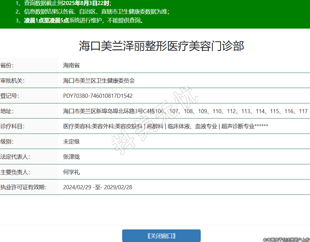 省份:海南省審批機(jī)關(guān):??谑忻捞m區(qū)衛(wèi)生健康委員會(huì)登記號(hào):PDY70380-746010817D1542地址:??谑忻捞m區(qū)新埠島埠北環(huán)路3號(hào)C4棟106、107、108、109、110、112、113、114、115、116、117診療科目:醫(yī)療美容科;美容外科;美容皮膚科 | 麻醉科 | 臨床體液、血液專業(yè) | 超聲診斷專業(yè)******級(jí)別:未定級(jí)法定代表人:張津瓏主要負(fù)責(zé)人:何學(xué)禮執(zhí)業(yè)許可證有效期:2024/02/29 -至- 2029/02/28 -