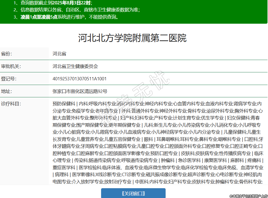 省份:河北省審批機(jī)關(guān):河北省衛(wèi)生健康委員會(huì)登記號(hào):40192537013070511A1001地址:張家口市宣化區(qū)清遠(yuǎn)路92號(hào)診療科目:預(yù)防保健科 | 內(nèi)科;呼吸內(nèi)科專業(yè);消化內(nèi)科專業(yè);神經(jīng)內(nèi)科專業(yè);心血管內(nèi)科專業(yè);血液內(nèi)科專業(yè);腎病學(xué)專業(yè);內(nèi)分泌專業(yè);免疫學(xué)專業(yè);老年病專業(yè) | 外科;普通外科專業(yè);神經(jīng)外科專業(yè);骨科專業(yè);泌尿外科專業(yè);胸外科專業(yè);心臟大血管外科專業(yè);整形外科專業(yè) | 婦產(chǎn)科;婦科專業(yè);產(chǎn)科專業(yè);計(jì)劃生育專業(yè);優(yōu)生學(xué)專業(yè) | 婦女保健科;青春期保健專業(yè);圍產(chǎn)期保健專業(yè);更年期保健專業(yè) | 兒科;新生兒專業(yè);小兒傳染病專業(yè);小兒消化專業(yè);小兒呼吸專業(yè);小兒心臟病專業(yè);小兒腎病專業(yè);小兒血液病專業(yè);小兒神經(jīng)病學(xué)專業(yè);小兒內(nèi)分泌專業(yè) | 兒童保健科;兒童生長(zhǎng)發(fā)育專業(yè);兒童營(yíng)養(yǎng)專業(yè);兒童五官保健專業(yè) | 眼科 | 耳鼻咽喉科;耳科專業(yè);鼻科專業(yè);咽喉科專業(yè) | 口腔科;牙體牙髓病專業(yè);牙周病專業(yè);口腔粘膜病專業(yè);兒童口腔專業(yè);口腔頜面外科專業(yè);口腔修復(fù)專業(yè);口腔正畸專業(yè);口腔種植專業(yè);口腔麻醉專業(yè);口腔頜面醫(yī)學(xué)影像專業(yè);預(yù)防口腔專業(yè) | 皮膚科;皮膚病專業(yè);性傳播疾病專業(yè) | 臨床心理專業(yè) | 傳染科;腸道傳染病專業(yè);呼吸道傳染病專業(yè) | 腫瘤科 | 急診醫(yī)學(xué)科 | 康復(fù)醫(yī)學(xué)科 | 麻醉科 | 疼痛科 | 重癥醫(yī)學(xué)科 | 醫(yī)學(xué)檢驗(yàn)科;臨床體液、血液專業(yè);臨床微生物學(xué)專業(yè);臨床化學(xué)檢驗(yàn)專業(yè);臨床免疫、血清學(xué)專業(yè) | 病理科 | 醫(yī)學(xué)影像科;X線診斷專業(yè);CT診斷專業(yè);磁共振成像診斷專業(yè);超聲診斷專業(yè);心電診斷專業(yè);神經(jīng)肌肉電圖專業(yè);介入放射學(xué)專業(yè);放射治療專業(yè) | 中醫(yī)科;內(nèi)科專業(yè);婦產(chǎn)科專業(yè);皮膚科專業(yè);腫瘤科專業(yè);骨傷科專業(yè);肛腸科專業(yè);老年病科專業(yè);針灸科專業(yè);推拿科專業(yè) | 中西醫(yī)結(jié)合科******級(jí)別:三級(jí)法定代表人:丁英奇主要負(fù)責(zé)人:執(zhí)業(yè)許可證有效期:2024/04/13 -至- 2029/12/16 -