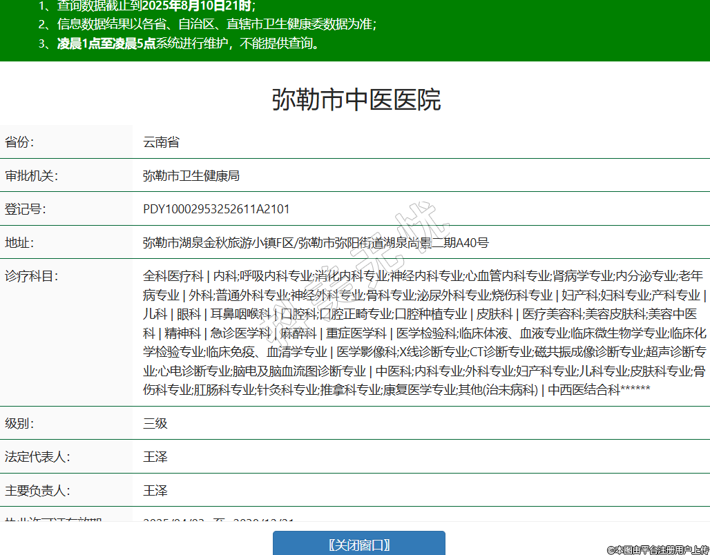 省份:云南省審批機(jī)關(guān):彌勒市衛(wèi)生健康局登記號(hào):PDY10002953252611A2101地址:彌勒市湖泉金秋旅游小鎮(zhèn)F區(qū)/彌勒市彌陽(yáng)街道湖泉尚景二期A40號(hào)診療科目:全科醫(yī)療科 | 內(nèi)科;呼吸內(nèi)科專業(yè);消化內(nèi)科專業(yè);神經(jīng)內(nèi)科專業(yè);心血管內(nèi)科專業(yè);腎病學(xué)專業(yè);內(nèi)分泌專業(yè);老年病專業(yè) | 外科;普通外科專業(yè);神經(jīng)外科專業(yè);骨科專業(yè);泌尿外科專業(yè);燒傷科專業(yè) | 婦產(chǎn)科;婦科專業(yè);產(chǎn)科專業(yè) | 兒科 | 眼科 | 耳鼻咽喉科 | 口腔科;口腔正畸專業(yè);口腔種植專業(yè) | 皮膚科 | 醫(yī)療美容科;美容皮膚科;美容中醫(yī)科 | 精神科 | 急診醫(yī)學(xué)科 | 麻醉科 | 重癥醫(yī)學(xué)科 | 醫(yī)學(xué)檢驗(yàn)科;臨床體液、血液專業(yè);臨床微生物學(xué)專業(yè);臨床化學(xué)檢驗(yàn)專業(yè);臨床免疫、血清學(xué)專業(yè) | 醫(yī)學(xué)影像科;X線診斷專業(yè);CT診斷專業(yè);磁共振成像診斷專業(yè);超聲診斷專業(yè);心電診斷專業(yè);腦電及腦血流圖診斷專業(yè) | 中醫(yī)科;內(nèi)科專業(yè);外科專業(yè);婦產(chǎn)科專業(yè);兒科專業(yè);皮膚科專業(yè);骨傷科專業(yè);肛腸科專業(yè);針灸科專業(yè);推拿科專業(yè);康復(fù)醫(yī)學(xué)專業(yè);其他(治未病科) | 中西醫(yī)結(jié)合科******級(jí)別:三級(jí)法定代表人:王澤主要負(fù)責(zé)人:王澤執(zhí)業(yè)許可證有效期:2025/04/03 -至- 2038/12/21 -