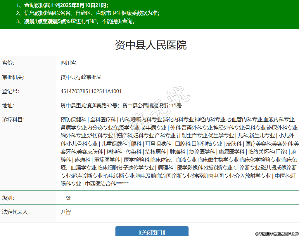 省份:四川省審批機(jī)關(guān):資中縣行政審批局登記號(hào):45147037851102511A1001地址:資中縣重龍鎮(zhèn)迎賓路92號(hào);資中縣公民鎮(zhèn)建設(shè)街115號(hào)診療科目:預(yù)防保健科 | 全科醫(yī)療科 | 內(nèi)科;呼吸內(nèi)科專業(yè);消化內(nèi)科專業(yè);神經(jīng)內(nèi)科專業(yè);心血管內(nèi)科專業(yè);血液內(nèi)科專業(yè);腎病學(xué)專業(yè);內(nèi)分泌專業(yè);免疫學(xué)專業(yè);老年病專業(yè) | 外科;普通外科專業(yè);神經(jīng)外科專業(yè);骨科專業(yè);泌尿外科專業(yè);胸外科專業(yè);燒傷科專業(yè) | 婦產(chǎn)科;婦科專業(yè);產(chǎn)科專業(yè);計(jì)劃生育專業(yè);優(yōu)生學(xué)專業(yè) | 兒科;新生兒專業(yè) | 小兒外科;小兒骨科專業(yè) | 兒童保健科 | 眼科 | 耳鼻咽喉科 | 口腔科;口腔種植專業(yè) | 皮膚科 | 醫(yī)療美容科;美容外科;美容牙科;美容皮膚科 | 精神科 | 傳染科 | 結(jié)核病科 | 腫瘤科 | 急診醫(yī)學(xué)科 | 康復(fù)醫(yī)學(xué)科 | 臨終關(guān)懷科(門診) | 麻醉科 | 疼痛科 | 重癥醫(yī)學(xué)科 | 醫(yī)學(xué)檢驗(yàn)科;臨床體液、血液專業(yè);臨床微生物學(xué)專業(yè);臨床化學(xué)檢驗(yàn)專業(yè);臨床免疫、血清學(xué)專業(yè);臨床細(xì)胞分子遺傳學(xué)專業(yè) | 病理科 | 醫(yī)學(xué)影像科;X線診斷專業(yè);CT診斷專業(yè);磁共振成像診斷專業(yè);超聲診斷專業(yè);心電診斷專業(yè);腦電及腦血流圖診斷專業(yè);神經(jīng)肌肉電圖專業(yè);介入放射學(xué)專業(yè) | 中醫(yī)科;肛腸科專業(yè) | 中西醫(yī)結(jié)合科******級別:三級法定代表人:尹智主要負(fù)責(zé)人:尹智執(zhí)業(yè)許可證有效期:2025/07/28 -至- 2030/12/31 -