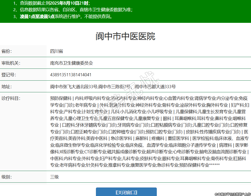 省份:四川省審批機關(guān):南充市衛(wèi)生健康委員會登記號:438913511381414041地址:閬中市張飛大道北段33號,閬中市三陳街7號,閬中市巴都大道333號診療科目:預防保健科 | 內(nèi)科;呼吸內(nèi)科專業(yè);消化內(nèi)科專業(yè);神經(jīng)內(nèi)科專業(yè);心血管內(nèi)科專業(yè);腎病學專業(yè);內(nèi)分泌專業(yè);免疫學專業(yè)(門診);老年病專業(yè) | 外科;普通外科專業(yè);神經(jīng)外科專業(yè);骨科專業(yè);泌尿外科專業(yè);胸外科專業(yè) | 婦產(chǎn)科;婦科專業(yè);產(chǎn)科專業(yè);計劃生育專業(yè) | 兒科;小兒消化專業(yè);小兒呼吸專業(yè) | 兒童保健科;兒童生長發(fā)育專業(yè);兒童營養(yǎng)專業(yè);兒童心理衛(wèi)生專業(yè);兒童五官保健專業(yè);兒童康復專業(yè) | 眼科 | 耳鼻咽喉科;耳科專業(yè);鼻科專業(yè);咽喉科專業(yè) | 口腔科;牙體牙髓病專業(yè)(門診);牙周病專業(yè)(門診);口腔粘膜病專業(yè)(門診);兒童口腔專業(yè)(門診);口腔修復專業(yè)(門診);口腔正畸專業(yè)(門診);口腔種植專業(yè)(門診);預防口腔專業(yè)(門診) | 皮膚科;性傳播疾病專業(yè)(門診) | 醫(yī)療美容科;美容外科;美容中醫(yī)科 | 急診醫(yī)學科 | 麻醉科 | 疼痛科 | 重癥醫(yī)學科 | 醫(yī)學檢驗科;臨床體液、血液專業(yè);臨床微生物學專業(yè);臨床化學檢驗專業(yè);臨床免疫、血清學專業(yè);臨床細胞分子遺傳學專業(yè) | 病理科 | 醫(yī)學影像科;X線診斷專業(yè);CT診斷專業(yè);磁共振成像診斷專業(yè);超聲診斷專業(yè);心電診斷專業(yè);腦電及腦血流圖診斷專業(yè) | 中醫(yī)科;內(nèi)科專業(yè);外科專業(yè);婦產(chǎn)科專業(yè);兒科專業(yè);皮膚科專業(yè);眼科專業(yè);耳鼻咽喉科專業(yè);骨傷科專業(yè);肛腸科專業(yè);老年病科專業(yè);針灸科專業(yè);推拿科專業(yè);康復醫(yī)學專業(yè);急診科專業(yè);預防保健科專業(yè)******級別:三級法定代表人:程簫寒主要負責人:董理執(zhí)業(yè)許可證有效期:2025/04/02 -至- 2025/11/30 -