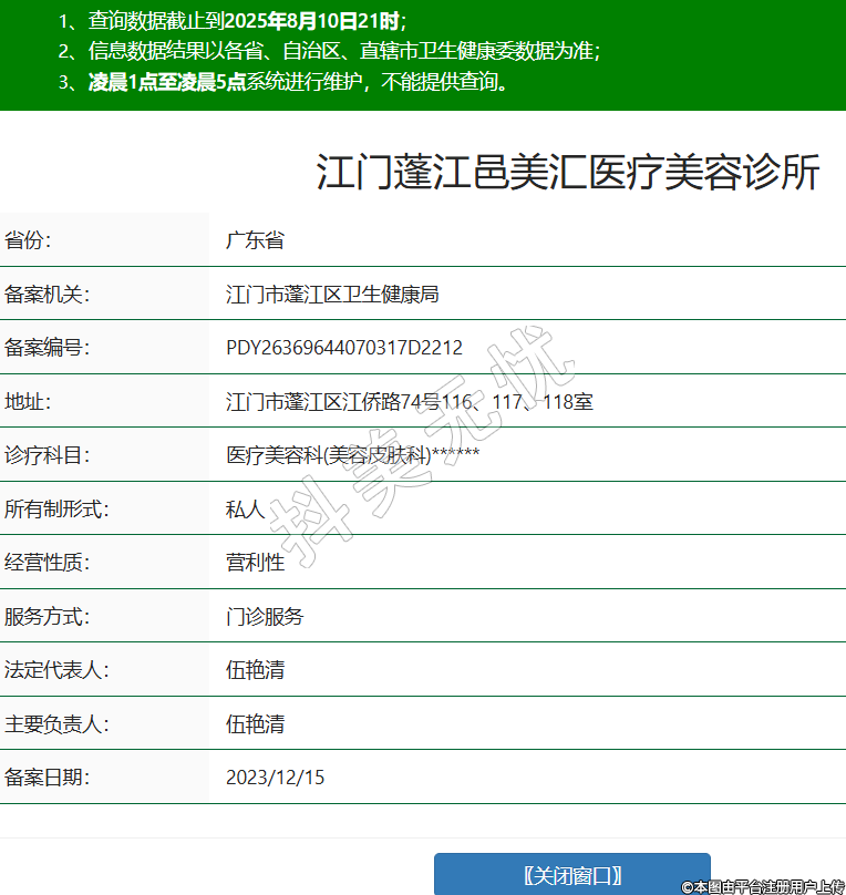 省份:廣東省備案機(jī)關(guān):江門市蓬江區(qū)衛(wèi)生健康局備案編號(hào):PDY26369644070317D2212地址:江門市蓬江區(qū)江僑路74號(hào)116、117、118室診療科目:醫(yī)療美容科(美容皮膚科)******所有制形式:私人經(jīng)營(yíng)性質(zhì):營(yíng)利性服務(wù)方式:門診服務(wù)法定代表人:伍艷清主要負(fù)責(zé)人:伍艷清備案日期:2023/12/15 -
