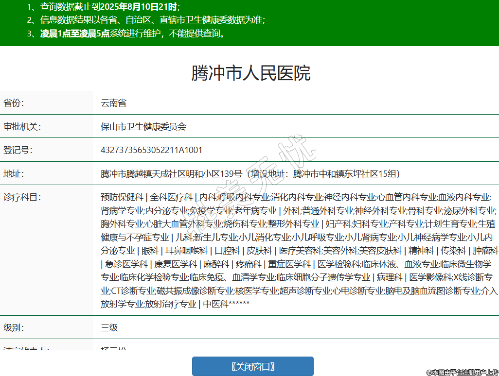 省份:云南省審批機關(guān):保山市衛(wèi)生健康委員會登記號:43273735653052211A1001地址:騰沖市騰越鎮(zhèn)天成社區(qū)明和小區(qū)139號(增設(shè)地址:騰沖市中和鎮(zhèn)東坪社區(qū)15組)診療科目:預(yù)防保健科 | 全科醫(yī)療科 | 內(nèi)科;呼吸內(nèi)科專業(yè);消化內(nèi)科專業(yè);神經(jīng)內(nèi)科專業(yè);心血管內(nèi)科專業(yè);血液內(nèi)科專業(yè);腎病學(xué)專業(yè);內(nèi)分泌專業(yè);免疫學(xué)專業(yè);老年病專業(yè) | 外科;普通外科專業(yè);神經(jīng)外科專業(yè);骨科專業(yè);泌尿外科專業(yè);胸外科專業(yè);心臟大血管外科專業(yè);燒傷科專業(yè);整形外科專業(yè) | 婦產(chǎn)科;婦科專業(yè);產(chǎn)科專業(yè);計劃生育專業(yè);生殖健康與不孕癥專業(yè) | 兒科;新生兒專業(yè);小兒消化專業(yè);小兒呼吸專業(yè);小兒腎病專業(yè);小兒神經(jīng)病學(xué)專業(yè);小兒內(nèi)分泌專業(yè) | 眼科 | 耳鼻咽喉科 | 口腔科 | 皮膚科 | 醫(yī)療美容科;美容外科;美容皮膚科 | 精神科 | 傳染科 | 腫瘤科 | 急診醫(yī)學(xué)科 | 康復(fù)醫(yī)學(xué)科 | 麻醉科 | 疼痛科 | 重癥醫(yī)學(xué)科 | 醫(yī)學(xué)檢驗科;臨床體液、血液專業(yè);臨床微生物學(xué)專業(yè);臨床化學(xué)檢驗專業(yè);臨床免疫、血清學(xué)專業(yè);臨床細胞分子遺傳學(xué)專業(yè) | 病理科 | 醫(yī)學(xué)影像科;X線診斷專業(yè);CT診斷專業(yè);磁共振成像診斷專業(yè);核醫(yī)學(xué)專業(yè);超聲診斷專業(yè);心電診斷專業(yè);腦電及腦血流圖診斷專業(yè);介入放射學(xué)專業(yè);放射治療專業(yè) | 中醫(yī)科******級別:三級法定代表人:楊元松主要負責(zé)人:楊元松執(zhí)業(yè)許可證有效期:2025/02/24 -至- 2036/11/01 -