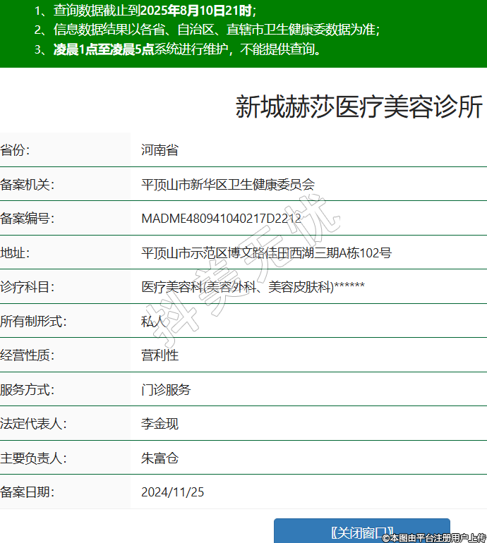 省份:河南省備案機(jī)關(guān):平頂山市新華區(qū)衛(wèi)生健康委員會(huì)備案編號(hào):MADME480941040217D2212地址:平頂山市示范區(qū)博文路佳田西湖三期A棟102號(hào)診療科目:醫(yī)療美容科(美容外科、美容皮膚科)******所有制形式:私人經(jīng)營(yíng)性質(zhì):營(yíng)利性服務(wù)方式:門(mén)診服務(wù)法定代表人:李金現(xiàn)主要負(fù)責(zé)人:朱富倉(cāng)備案日期:2024/11/25 -