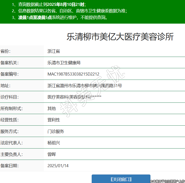 省份:浙江省備案機(jī)關(guān):樂清市衛(wèi)生健康局備案編號:MAC1987B533038215D2212地址:浙江省溫州市樂清市柳市鎮(zhèn)興隆西路31號診療科目:醫(yī)療美容科(美容皮膚科)******所有制形式:其他經(jīng)營性質(zhì):營利性服務(wù)方式:門診服務(wù)法定代表人:楊祖興主要負(fù)責(zé)人:曾暉備案日期:2025/01/14 -
