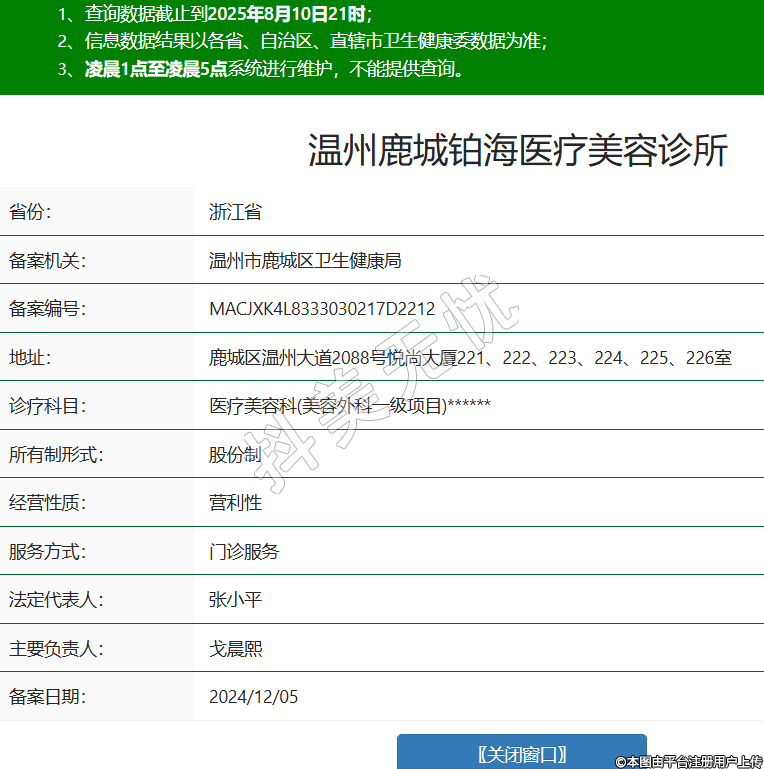 省份:浙江省備案機(jī)關(guān):溫州市鹿城區(qū)衛(wèi)生健康局備案編號(hào):MACJXK4L8333030217D2212地址:鹿城區(qū)溫州大道2088號(hào)悅尚大廈221、222、223、224、225、226室診療科目:醫(yī)療美容科(美容外科一級(jí)項(xiàng)目)******所有制形式:股份制經(jīng)營(yíng)性質(zhì):營(yíng)利性服務(wù)方式:門(mén)診服務(wù)法定代表人:張小平主要負(fù)責(zé)人:戈晨熙備案日期:2024/12/05 -