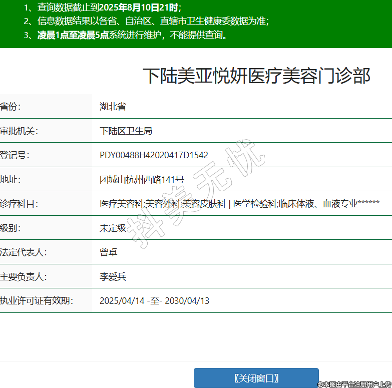 下陸美亞悅妍醫(yī)療美容門診部,診療科目:醫(yī)療美容科;美容外科;美容皮膚科 | 醫(yī)學(xué)檢驗(yàn)科;臨床體液、血液專業(yè)******