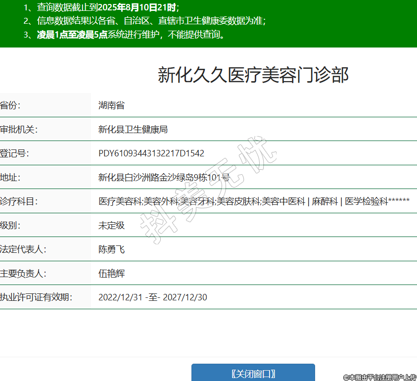 省份:湖南省審批機(jī)關(guān):新化縣衛(wèi)生健康局登記號:PDY61093443132217D1542地址:新化縣白沙洲路金沙綠島9棟101號診療科目:醫(yī)療美容科;美容外科;美容牙科;美容皮膚科;美容中醫(yī)科 | 麻醉科 | 醫(yī)學(xué)檢驗科******級別:未定級法定代表人:陳勇飛主要負(fù)責(zé)人:伍艷輝執(zhí)業(yè)許可證有效期:2022/12/31 -至- 2027/12/30 -