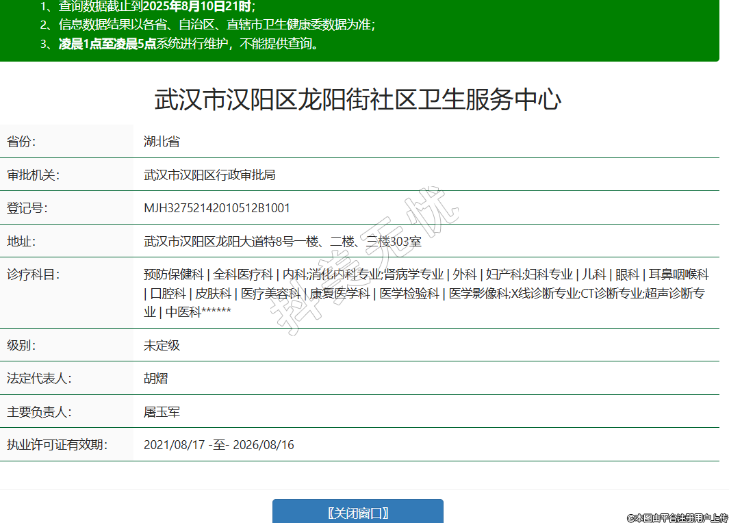 省份:湖北省審批機關(guān):武漢市漢陽區(qū)行政審批局登記號:MJH32752142010512B1001地址:武漢市漢陽區(qū)龍陽大道特8號一樓、二樓、三樓303室診療科目:預防保健科 | 全科醫(yī)療科 | 內(nèi)科;消化內(nèi)科專業(yè);腎病學專業(yè) | 外科 | 婦產(chǎn)科;婦科專業(yè) | 兒科 | 眼科 | 耳鼻咽喉科 | 口腔科 | 皮膚科 | 醫(yī)療美容科 | 康復醫(yī)學科 | 醫(yī)學檢驗科 | 醫(yī)學影像科;X線診斷專業(yè);CT診斷專業(yè);超聲診斷專業(yè) | 中醫(yī)科******級別:未定級法定代表人:胡熠主要負責人:屠玉軍執(zhí)業(yè)許可證有效期:2021/08/17 -至- 2026/08/16 -