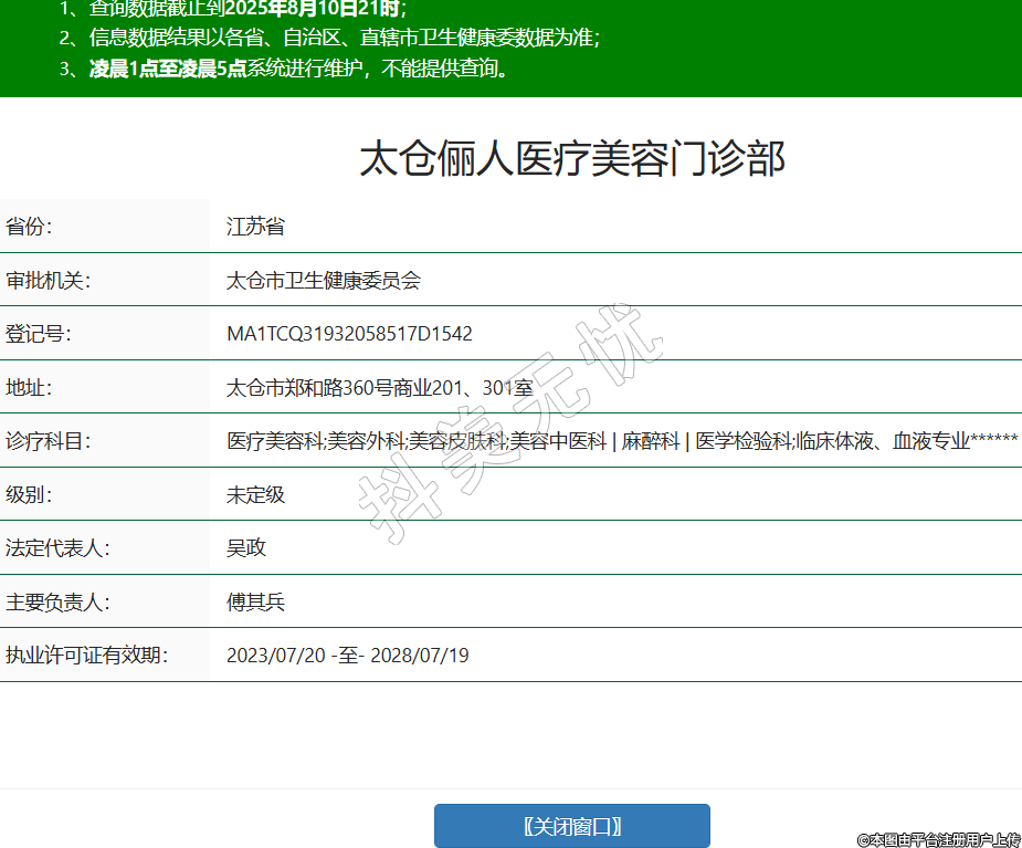 太倉儷人醫(yī)療美容門診部,診療科目:醫(yī)療美容科;美容外科;美容皮膚科;美容中醫(yī)科 | 麻醉科 | 醫(yī)學(xué)檢驗(yàn)科;臨床體液、血液專業(yè)******