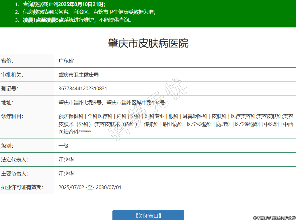 省份:廣東省審批機(jī)關(guān):肇慶市衛(wèi)生健康局登記號(hào):367784441202310831地址:肇慶市端州七路9號(hào)、肇慶市端州區(qū)城中路194號(hào)診療科目:預(yù)防保健科 | 全科醫(yī)療科 | 內(nèi)科 | 外科 | 婦科專業(yè) | 眼科 | 耳鼻咽喉科 | 皮膚科 | 醫(yī)療美容科;美容皮膚科;美容皮膚術(shù)(外科);美容皮膚術(shù)(內(nèi)科) | 傳染科 | 職業(yè)病科 | 醫(yī)學(xué)檢驗(yàn)科 | 病理科 | 醫(yī)學(xué)影像科 | 中醫(yī)科 | 中西醫(yī)結(jié)合科******級(jí)別:一級(jí)法定代表人:江少華主要負(fù)責(zé)人:江少華執(zhí)業(yè)許可證有效期:2025/07/02 -至- 2030/07/01 -