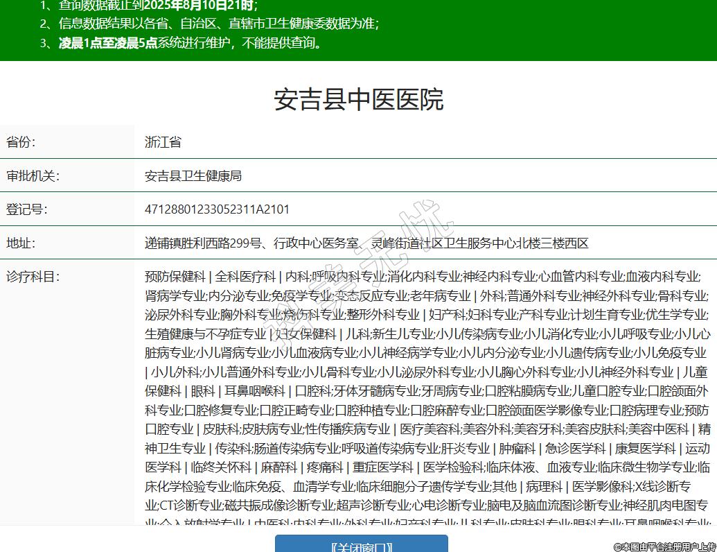 審批機(jī)關(guān):安吉縣衛(wèi)生健康局登記號(hào):47128801233052311A2101地址:遞鋪鎮(zhèn)勝利西路299號(hào)、行政中心醫(yī)務(wù)室、靈峰街道社區(qū)衛(wèi)生服務(wù)中心北樓三樓西區(qū)診療科目:預(yù)防保健科 | 全科醫(yī)療科 | 內(nèi)科;呼吸內(nèi)科專(zhuān)業(yè);消化內(nèi)科專(zhuān)業(yè);神經(jīng)內(nèi)科專(zhuān)業(yè);心血管內(nèi)科專(zhuān)業(yè);血液內(nèi)科專(zhuān)業(yè);腎病學(xué)專(zhuān)業(yè);內(nèi)分泌專(zhuān)業(yè);免疫學(xué)專(zhuān)業(yè);變態(tài)反應(yīng)專(zhuān)業(yè);老年病專(zhuān)業(yè) | 外科;普通外科專(zhuān)業(yè);神經(jīng)外科專(zhuān)業(yè);骨科專(zhuān)業(yè);泌尿外科專(zhuān)業(yè);胸外科專(zhuān)業(yè);燒傷科專(zhuān)業(yè);整形外科專(zhuān)業(yè) | 婦產(chǎn)科;婦科專(zhuān)業(yè);產(chǎn)科專(zhuān)業(yè);計(jì)劃生育專(zhuān)業(yè);優(yōu)生學(xué)專(zhuān)業(yè);生殖健康與不孕癥專(zhuān)業(yè) | 婦女保健科 | 兒科;新生兒專(zhuān)業(yè);小兒傳染病專(zhuān)業(yè);小兒消化專(zhuān)業(yè);小兒呼吸專(zhuān)業(yè);小兒心臟病專(zhuān)業(yè);小兒腎病專(zhuān)業(yè);小兒血液病專(zhuān)業(yè);小兒神經(jīng)病學(xué)專(zhuān)業(yè);小兒內(nèi)分泌專(zhuān)業(yè);小兒遺傳病專(zhuān)業(yè);小兒免疫專(zhuān)業(yè) | 小兒外科;小兒普通外科專(zhuān)業(yè);小兒骨科專(zhuān)業(yè);小兒泌尿外科專(zhuān)業(yè);小兒胸心外科專(zhuān)業(yè);小兒神經(jīng)外科專(zhuān)業(yè) | 兒童保健科 | 眼科 | 耳鼻咽喉科 | 口腔科;牙體牙髓病專(zhuān)業(yè);牙周病專(zhuān)業(yè);口腔粘膜病專(zhuān)業(yè);兒童口腔專(zhuān)業(yè);口腔頜面外科專(zhuān)業(yè);口腔修復(fù)專(zhuān)業(yè);口腔正畸專(zhuān)業(yè);口腔種植專(zhuān)業(yè);口腔麻醉專(zhuān)業(yè);口腔頜面醫(yī)學(xué)影像專(zhuān)業(yè);口腔病理專(zhuān)業(yè);預(yù)防口腔專(zhuān)業(yè) | 皮膚科;皮膚病專(zhuān)業(yè);性傳播疾病專(zhuān)業(yè) | 醫(yī)療美容科;美容外科;美容牙科;美容皮膚科;美容中醫(yī)科 | 精神衛(wèi)生專(zhuān)業(yè) | 傳染科;腸道傳染病專(zhuān)業(yè);呼吸道傳染病專(zhuān)業(yè);肝炎專(zhuān)業(yè) | 腫瘤科 | 急診醫(yī)學(xué)科 | 康復(fù)醫(yī)學(xué)科 | 運(yùn)動(dòng)醫(yī)學(xué)科 | 臨終關(guān)懷科 | 麻醉科 | 疼痛科 | 重癥醫(yī)學(xué)科 | 醫(yī)學(xué)檢驗(yàn)科;臨床體液、血液專(zhuān)業(yè);臨床微生物學(xué)專(zhuān)業(yè);臨床化學(xué)檢驗(yàn)專(zhuān)業(yè);臨床免疫、血清學(xué)專(zhuān)業(yè);臨床細(xì)胞分子遺傳學(xué)專(zhuān)業(yè);其他 | 病理科 | 醫(yī)學(xué)影像科;X線診斷專(zhuān)業(yè);CT診斷專(zhuān)業(yè);磁共振成像診斷專(zhuān)業(yè);超聲診斷專(zhuān)業(yè);心電診斷專(zhuān)業(yè);腦電及腦血流圖診斷專(zhuān)業(yè);神經(jīng)肌肉電圖專(zhuān)業(yè);介入放射學(xué)專(zhuān)業(yè) | 中醫(yī)科;內(nèi)科專(zhuān)業(yè);外科專(zhuān)業(yè);婦產(chǎn)科專(zhuān)業(yè);兒科專(zhuān)業(yè);皮膚科專(zhuān)業(yè);眼科專(zhuān)業(yè);耳鼻咽喉科專(zhuān)業(yè);口腔科專(zhuān)業(yè);腫瘤科專(zhuān)業(yè);骨傷科專(zhuān)業(yè);肛腸科專(zhuān)業(yè);老年病科專(zhuān)業(yè);針灸科專(zhuān)業(yè);推拿科專(zhuān)業(yè);康復(fù)醫(yī)學(xué)專(zhuān)業(yè);急診科專(zhuān)業(yè);預(yù)防保健科專(zhuān)業(yè) | 中西醫(yī)結(jié)合科******級(jí)別:三級(jí)法定代表人:程艷主要負(fù)責(zé)人:程艷執(zhí)業(yè)許可證有效期:2025/04/22 -至- 2035/04/01 -
