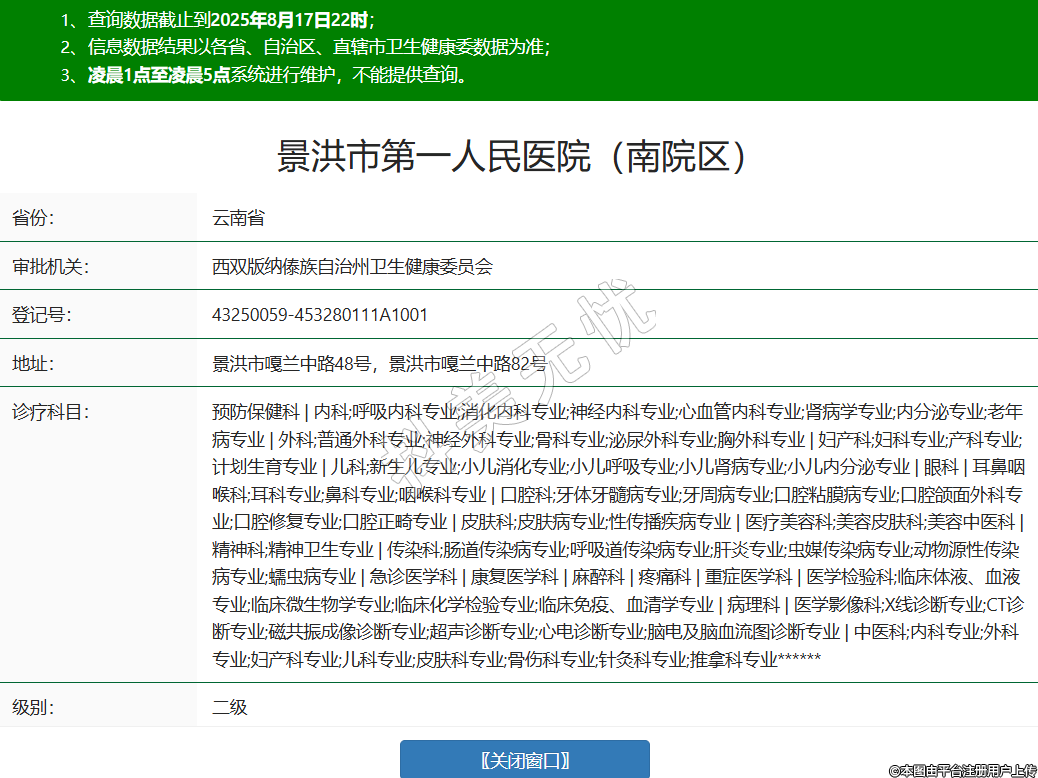 省份:云南省審批機(jī)關(guān):西雙版納傣族自治州衛(wèi)生健康委員會(huì)登記號(hào):43250059-453280111A1001地址:景洪市嘎蘭中路48號(hào),景洪市嘎蘭中路82號(hào)診療科目:預(yù)防保健科 | 內(nèi)科;呼吸內(nèi)科專(zhuān)業(yè);消化內(nèi)科專(zhuān)業(yè);神經(jīng)內(nèi)科專(zhuān)業(yè);心血管內(nèi)科專(zhuān)業(yè);腎病學(xué)專(zhuān)業(yè);內(nèi)分泌專(zhuān)業(yè);老年病專(zhuān)業(yè) | 外科;普通外科專(zhuān)業(yè);神經(jīng)外科專(zhuān)業(yè);骨科專(zhuān)業(yè);泌尿外科專(zhuān)業(yè);胸外科專(zhuān)業(yè) | 婦產(chǎn)科;婦科專(zhuān)業(yè);產(chǎn)科專(zhuān)業(yè);計(jì)劃生育專(zhuān)業(yè) | 兒科;新生兒專(zhuān)業(yè);小兒消化專(zhuān)業(yè);小兒呼吸專(zhuān)業(yè);小兒腎病專(zhuān)業(yè);小兒內(nèi)分泌專(zhuān)業(yè) | 眼科 | 耳鼻咽喉科;耳科專(zhuān)業(yè);鼻科專(zhuān)業(yè);咽喉科專(zhuān)業(yè) | 口腔科;牙體牙髓病專(zhuān)業(yè);牙周病專(zhuān)業(yè);口腔粘膜病專(zhuān)業(yè);口腔頜面外科專(zhuān)業(yè);口腔修復(fù)專(zhuān)業(yè);口腔正畸專(zhuān)業(yè) | 皮膚科;皮膚病專(zhuān)業(yè);性傳播疾病專(zhuān)業(yè) | 醫(yī)療美容科;美容皮膚科;美容中醫(yī)科 | 精神科;精神衛(wèi)生專(zhuān)業(yè) | 傳染科;腸道傳染病專(zhuān)業(yè);呼吸道傳染病專(zhuān)業(yè);肝炎專(zhuān)業(yè);蟲(chóng)媒傳染病專(zhuān)業(yè);動(dòng)物源性傳染病專(zhuān)業(yè);蠕蟲(chóng)病專(zhuān)業(yè) | 急診醫(yī)學(xué)科 | 康復(fù)醫(yī)學(xué)科 | 麻醉科 | 疼痛科 | 重癥醫(yī)學(xué)科 | 醫(yī)學(xué)檢驗(yàn)科;臨床體液、血液專(zhuān)業(yè);臨床微生物學(xué)專(zhuān)業(yè);臨床化學(xué)檢驗(yàn)專(zhuān)業(yè);臨床免疫、血清學(xué)專(zhuān)業(yè) | 病理科 | 醫(yī)學(xué)影像科;X線診斷專(zhuān)業(yè);CT診斷專(zhuān)業(yè);磁共振成像診斷專(zhuān)業(yè);超聲診斷專(zhuān)業(yè);心電診斷專(zhuān)業(yè);腦電及腦血流圖診斷專(zhuān)業(yè) | 中醫(yī)科;內(nèi)科專(zhuān)業(yè);外科專(zhuān)業(yè);婦產(chǎn)科專(zhuān)業(yè);兒科專(zhuān)業(yè);皮膚科專(zhuān)業(yè);骨傷科專(zhuān)業(yè);針灸科專(zhuān)業(yè);推拿科專(zhuān)業(yè)******級(jí)別:二級(jí)法定代表人:段世澤主要負(fù)責(zé)人:段家鏡執(zhí)業(yè)許可證有效期:2024/08/29 -至- 2038/09/18 -