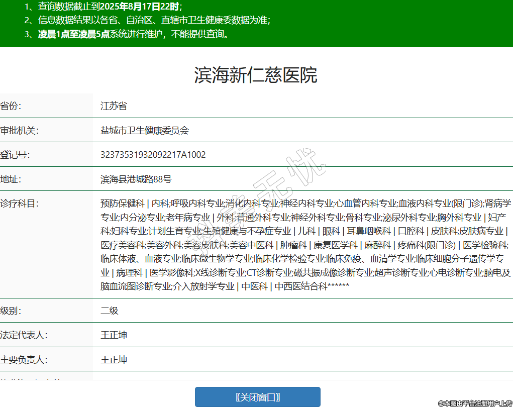 省份:江蘇省審批機(jī)關(guān):鹽城市衛(wèi)生健康委員會登記號:32373531932092217A1002地址:濱??h港城路88號診療科目:預(yù)防保健科 | 內(nèi)科;呼吸內(nèi)科專業(yè);消化內(nèi)科專業(yè);神經(jīng)內(nèi)科專業(yè);心血管內(nèi)科專業(yè);血液內(nèi)科專業(yè)(限門診);腎病學(xué)專業(yè);內(nèi)分泌專業(yè);老年病專業(yè) | 外科;普通外科專業(yè);神經(jīng)外科專業(yè);骨科專業(yè);泌尿外科專業(yè);胸外科專業(yè) | 婦產(chǎn)科;婦科專業(yè);計劃生育專業(yè);生殖健康與不孕癥專業(yè) | 兒科 | 眼科 | 耳鼻咽喉科 | 口腔科 | 皮膚科;皮膚病專業(yè) | 醫(yī)療美容科;美容外科;美容皮膚科;美容中醫(yī)科 | 腫瘤科 | 康復(fù)醫(yī)學(xué)科 | 麻醉科 | 疼痛科(限門診) | 醫(yī)學(xué)檢驗科;臨床體液、血液專業(yè);臨床微生物學(xué)專業(yè);臨床化學(xué)檢驗專業(yè);臨床免疫、血清學(xué)專業(yè);臨床細(xì)胞分子遺傳學(xué)專業(yè) | 病理科 | 醫(yī)學(xué)影像科;X線診斷專業(yè);CT診斷專業(yè);磁共振成像診斷專業(yè);超聲診斷專業(yè);心電診斷專業(yè);腦電及腦血流圖診斷專業(yè);介入放射學(xué)專業(yè) | 中醫(yī)科 | 中西醫(yī)結(jié)合科******級別:二級法定代表人:王正坤主要負(fù)責(zé)人:王正坤執(zhí)業(yè)許可證有效期:2021/09/23 -至- 2036/09/22 -