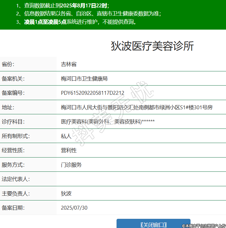 省份:吉林省備案機(jī)關(guān):梅河口市衛(wèi)生健康局備案編號(hào):PDY61520922058117D2212地址:梅河口市人民大街與景陽(yáng)路交匯處南側(cè)都市綠洲小區(qū)S1#樓301號(hào)房診療科目:醫(yī)療美容科(美容外科、美容皮膚科)******所有制形式:私人經(jīng)營(yíng)性質(zhì):營(yíng)利性服務(wù)方式:門診服務(wù)法定代表人:主要負(fù)責(zé)人:狄波備案日期:2025/07/30 -