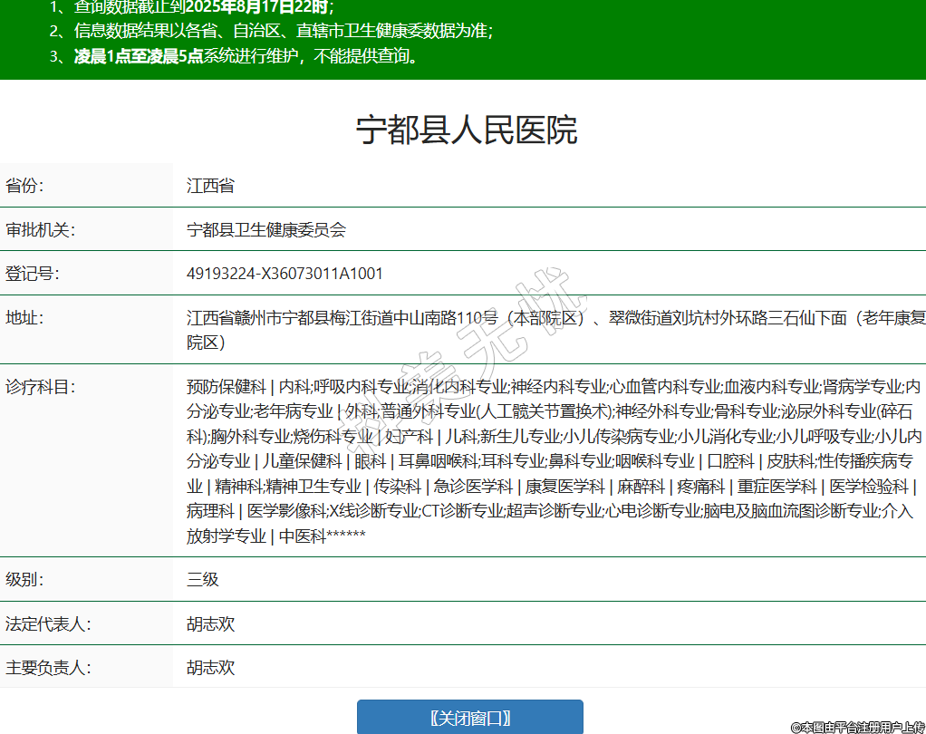 省份:江西省審批機(jī)關(guān):寧都縣衛(wèi)生健康委員會登記號:49193224-X36073011A1001地址:江西省贛州市寧都縣梅江街道中山南路110號(本部院區(qū))、翠微街道劉坑村外環(huán)路三石仙下面(老年康復(fù)院區(qū))診療科目:預(yù)防保健科 | 內(nèi)科;呼吸內(nèi)科專業(yè);消化內(nèi)科專業(yè);神經(jīng)內(nèi)科專業(yè);心血管內(nèi)科專業(yè);血液內(nèi)科專業(yè);腎病學(xué)專業(yè);內(nèi)分泌專業(yè);老年病專業(yè) | 外科;普通外科專業(yè)(人工髖關(guān)節(jié)置換術(shù));神經(jīng)外科專業(yè);骨科專業(yè);泌尿外科專業(yè)(碎石科);胸外科專業(yè);燒傷科專業(yè) | 婦產(chǎn)科 | 兒科;新生兒專業(yè);小兒傳染病專業(yè);小兒消化專業(yè);小兒呼吸專業(yè);小兒內(nèi)分泌專業(yè) | 兒童保健科 | 眼科 | 耳鼻咽喉科;耳科專業(yè);鼻科專業(yè);咽喉科專業(yè) | 口腔科 | 皮膚科;性傳播疾病專業(yè) | 精神科;精神衛(wèi)生專業(yè) | 傳染科 | 急診醫(yī)學(xué)科 | 康復(fù)醫(yī)學(xué)科 | 麻醉科 | 疼痛科 | 重癥醫(yī)學(xué)科 | 醫(yī)學(xué)檢驗(yàn)科 | 病理科 | 醫(yī)學(xué)影像科;X線診斷專業(yè);CT診斷專業(yè);超聲診斷專業(yè);心電診斷專業(yè);腦電及腦血流圖診斷專業(yè);介入放射學(xué)專業(yè) | 中醫(yī)科******級別:三級法定代表人:胡志歡主要負(fù)責(zé)人:胡志歡執(zhí)業(yè)許可證有效期:2025/08/01 -至- 2028/07/31 -