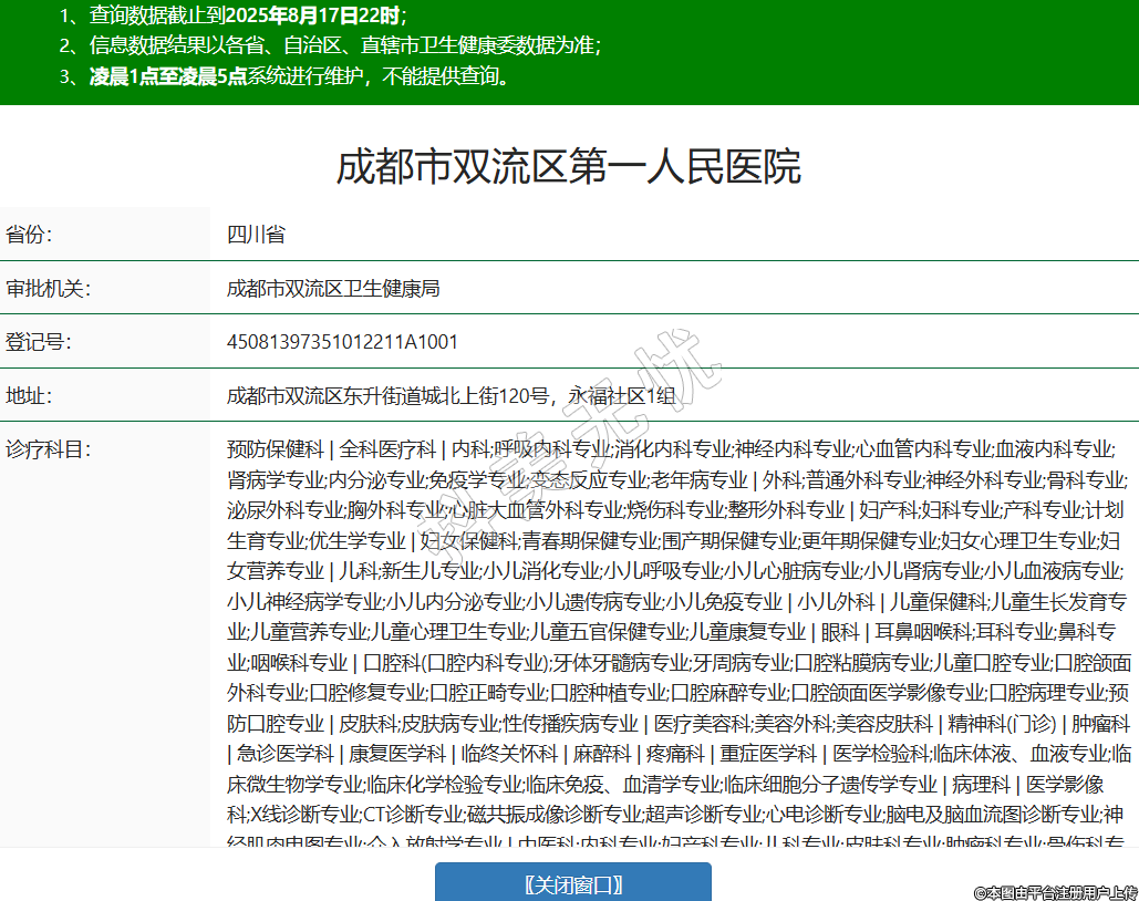 省份:四川省審批機關:成都市雙流區(qū)衛(wèi)生健康局登記號:45081397351012211A1001地址:成都市雙流區(qū)東升街道城北上街120號,永福社區(qū)1組診療科目:預防保健科 | 全科醫(yī)療科 | 內科;呼吸內科專業(yè);消化內科專業(yè);神經(jīng)內科專業(yè);心血管內科專業(yè);血液內科專業(yè);腎病學專業(yè);內分泌專業(yè);免疫學專業(yè);變態(tài)反應專業(yè);老年病專業(yè) | 外科;普通外科專業(yè);神經(jīng)外科專業(yè);骨科專業(yè);泌尿外科專業(yè);胸外科專業(yè);心臟大血管外科專業(yè);燒傷科專業(yè);整形外科專業(yè) | 婦產科;婦科專業(yè);產科專業(yè);計劃生育專業(yè);優(yōu)生學專業(yè) | 婦女保健科;青春期保健專業(yè);圍產期保健專業(yè);更年期保健專業(yè);婦女心理衛(wèi)生專業(yè);婦女營養(yǎng)專業(yè) | 兒科;新生兒專業(yè);小兒消化專業(yè);小兒呼吸專業(yè);小兒心臟病專業(yè);小兒腎病專業(yè);小兒血液病專業(yè);小兒神經(jīng)病學專業(yè);小兒內分泌專業(yè);小兒遺傳病專業(yè);小兒免疫專業(yè) | 小兒外科 | 兒童保健科;兒童生長發(fā)育專業(yè);兒童營養(yǎng)專業(yè);兒童心理衛(wèi)生專業(yè);兒童五官保健專業(yè);兒童康復專業(yè) | 眼科 | 耳鼻咽喉科;耳科專業(yè);鼻科專業(yè);咽喉科專業(yè) | 口腔科(口腔內科專業(yè));牙體牙髓病專業(yè);牙周病專業(yè);口腔粘膜病專業(yè);兒童口腔專業(yè);口腔頜面外科專業(yè);口腔修復專業(yè);口腔正畸專業(yè);口腔種植專業(yè);口腔麻醉專業(yè);口腔頜面醫(yī)學影像專業(yè);口腔病理專業(yè);預防口腔專業(yè) | 皮膚科;皮膚病專業(yè);性傳播疾病專業(yè) | 醫(yī)療美容科;美容外科;美容皮膚科 | 精神科(門診) | 腫瘤科 | 急診醫(yī)學科 | 康復醫(yī)學科 | 臨終關懷科 | 麻醉科 | 疼痛科 | 重癥醫(yī)學科 | 醫(yī)學檢驗科;臨床體液、血液專業(yè);臨床微生物學專業(yè);臨床化學檢驗專業(yè);臨床免疫、血清學專業(yè);臨床細胞分子遺傳學專業(yè) | 病理科 | 醫(yī)學影像科;X線診斷專業(yè);CT診斷專業(yè);磁共振成像診斷專業(yè);超聲診斷專業(yè);心電診斷專業(yè);腦電及腦血流圖診斷專業(yè);神經(jīng)肌肉電圖專業(yè);介入放射學專業(yè) | 中醫(yī)科;內科專業(yè);婦產科專業(yè);兒科專業(yè);皮膚科專業(yè);腫瘤科專業(yè);骨傷科專業(yè);肛腸科專業(yè);老年病科專業(yè);針灸科專業(yè);推拿科專業(yè);康復醫(yī)學專業(yè);預防保健科專業(yè) | 中西醫(yī)結合科(限神經(jīng)內科,心血管內科,腎內科,內分泌科,普外科,神經(jīng)外科,骨科,泌尿外科,婦科,皮膚病專業(yè),腫瘤科,中醫(yī)骨傷科,中醫(yī)肛腸科,中醫(yī)康復醫(yī)學科開展互聯(lián)網(wǎng)診療)******級別:三級法定代表人:萬美華主要負責人:執(zhí)業(yè)許可證有效期:2023/04/28 -至- 2038/05/01 -