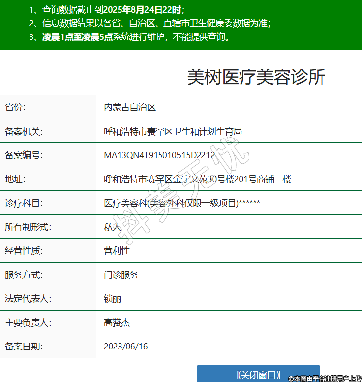 省份:內(nèi)蒙古自治區(qū)備案機(jī)關(guān):呼和浩特市賽罕區(qū)衛(wèi)生和計(jì)劃生育局備案編號(hào):MA13QN4T915010515D2212地址:呼和浩特市賽罕區(qū)金宇文苑30號(hào)樓201號(hào)商鋪二樓診療科目:醫(yī)療美容科(美容外科僅限一級(jí)項(xiàng)目)******所有制形式:私人經(jīng)營性質(zhì):營利性服務(wù)方式:門診服務(wù)法定代表人:鎖麗主要負(fù)責(zé)人:高贊杰備案日期:2023/06/16 -
