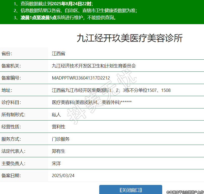 省份:江西省備案機(jī)關(guān):九江經(jīng)濟(jì)技術(shù)開發(fā)區(qū)衛(wèi)生和計(jì)劃生育委員會(huì)備案編號(hào):MADPPTWR336041317D2212地址:江西省九江市經(jīng)開區(qū)柴桑國(guó)際1、2、3棟不分單位1507、1508診療科目:醫(yī)療美容科(美容皮膚科、美容外科)******所有制形式:私人經(jīng)營(yíng)性質(zhì):營(yíng)利性服務(wù)方式:門診服務(wù)法定代表人:鄭有生主要負(fù)責(zé)人:宋洋備案日期:2025/03/24 -