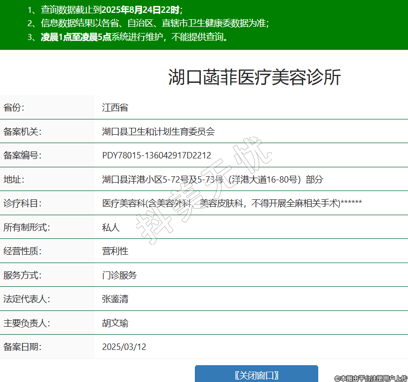 省份:江西省備案機關(guān):湖口縣衛(wèi)生和計劃生育委員會備案編號:PDY78015-136042917D2212地址:湖口縣洋港小區(qū)5-72號及5-73號(洋港大道16-80號)部分診療科目:醫(yī)療美容科(含美容外科、美容皮膚科,不得開展全麻相關(guān)手術(shù))******所有制形式:私人經(jīng)營性質(zhì):營利性服務(wù)方式:門診服務(wù)法定代表人:張鑒清主要負責人:胡文瑜備案日期:2025/03/12 -