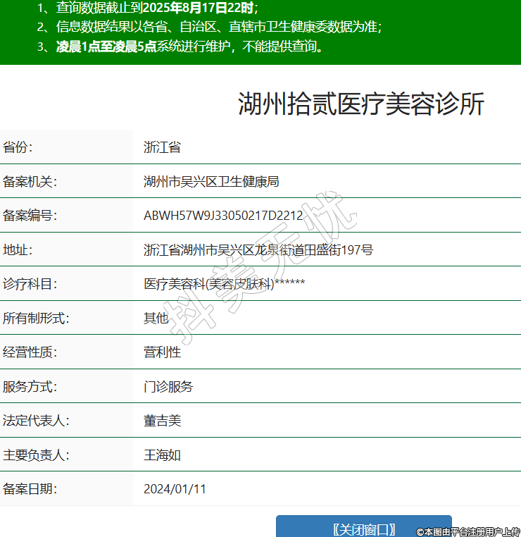 省份:浙江省備案機(jī)關(guān):湖州市吳興區(qū)衛(wèi)生健康局備案編號(hào):ABWH57W9J33050217D2212地址:浙江省湖州市吳興區(qū)龍泉街道田盛街197號(hào)診療科目:醫(yī)療美容科(美容皮膚科)******所有制形式:其他經(jīng)營(yíng)性質(zhì):營(yíng)利性服務(wù)方式:門診服務(wù)法定代表人:董吉美主要負(fù)責(zé)人:王海如備案日期:2024/01/11 -