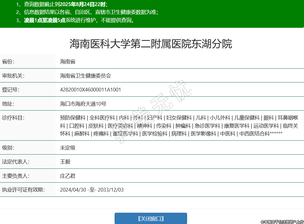 省份:海南省審批機(jī)關(guān):海南省衛(wèi)生健康委員會(huì)登記號(hào):42820010X46000011A1001地址:??谑泻8蟮?0號(hào)診療科目:預(yù)防保健科 | 全科醫(yī)療科 | 內(nèi)科 | 外科 | 婦產(chǎn)科 | 婦女保健科 | 兒科 | 小兒外科 | 兒童保健科 | 眼科 | 耳鼻咽喉科 | 口腔科 | 皮膚科 | 醫(yī)療美容科 | 精神科 | 傳染科 | 腫瘤科 | 急診醫(yī)學(xué)科 | 康復(fù)醫(yī)學(xué)科 | 運(yùn)動(dòng)醫(yī)學(xué)科 | 臨終關(guān)懷科 | 麻醉科 | 疼痛科 | 重癥醫(yī)學(xué)科 | 醫(yī)學(xué)檢驗(yàn)科 | 病理科 | 醫(yī)學(xué)影像科 | 中醫(yī)科 | 中西醫(yī)結(jié)合科******級(jí)別:未定級(jí)法定代表人:王毅主要負(fù)責(zé)人:莊乙君執(zhí)業(yè)許可證有效期:2024/04/30 -至- 2033/12/03 -