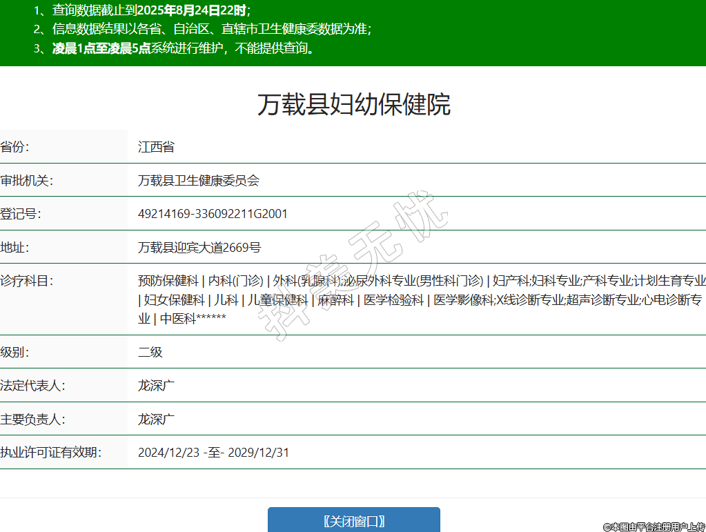 省份:江西省審批機(jī)關(guān):萬載縣衛(wèi)生健康委員會(huì)登記號(hào):49214169-336092211G2001地址:萬載縣迎賓大道2669號(hào)診療科目:預(yù)防保健科 | 內(nèi)科(門診) | 外科(乳腺科);泌尿外科專業(yè)(男性科門診) | 婦產(chǎn)科;婦科專業(yè);產(chǎn)科專業(yè);計(jì)劃生育專業(yè) | 婦女保健科 | 兒科 | 兒童保健科 | 麻醉科 | 醫(yī)學(xué)檢驗(yàn)科 | 醫(yī)學(xué)影像科;X線診斷專業(yè);超聲診斷專業(yè);心電診斷專業(yè) | 中醫(yī)科******級(jí)別:二級(jí)法定代表人:龍深廣主要負(fù)責(zé)人:龍深廣執(zhí)業(yè)許可證有效期:2024/12/23 -至- 2029/12/31 -