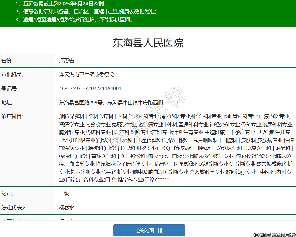 省份:江蘇省審批機關(guān):連云港市衛(wèi)生健康委員會登記號:46817597-332072211A1001地址:東海縣富國路299號;東海縣牛山鎮(zhèn)牛房路西側(cè)診療科目:預防保健科 | 全科醫(yī)療科 | 內(nèi)科;呼吸內(nèi)科專業(yè);消化內(nèi)科專業(yè);神經(jīng)內(nèi)科專業(yè);心血管內(nèi)科專業(yè);血液內(nèi)科專業(yè);腎病學專業(yè);內(nèi)分泌專業(yè);免疫學專業(yè);老年病專業(yè) | 外科;普通外科專業(yè);神經(jīng)外科專業(yè);骨科專業(yè);泌尿外科專業(yè);胸外科專業(yè);燒傷科專業(yè) | 婦產(chǎn)科;婦科專業(yè);產(chǎn)科專業(yè);計劃生育專業(yè);生殖健康與不孕癥專業(yè) | 兒科;新生兒專業(yè);小兒呼吸專業(yè)(門診) | 小兒外科 | 兒童保健科(門診) | 眼科 | 耳鼻咽喉科 | 口腔科 | 皮膚科;皮膚病專業(yè);性傳播疾病專業(yè) | 精神科(門診) | 傳染科;肝炎專業(yè)(門診) | 結(jié)核病科 | 腫瘤科 | 急診醫(yī)學科 | 康復醫(yī)學科 | 麻醉科 | 疼痛科(門診) | 重癥醫(yī)學科 | 醫(yī)學檢驗科;臨床體液、血液專業(yè);臨床微生物學專業(yè);臨床化學檢驗專業(yè);臨床免疫、血清學專業(yè);臨床細胞分子遺傳學專業(yè) | 病理科 | 醫(yī)學影像科;X線診斷專業(yè);CT診斷專業(yè);磁共振成像診斷專業(yè);超聲診斷專業(yè);心電診斷專業(yè);腦電及腦血流圖診斷專業(yè);介入放射學專業(yè);放射治療專業(yè) | 中醫(yī)科;內(nèi)科專業(yè)(門診);針灸科專業(yè)(門診);推拿科專業(yè)(門診)******級別:三級法定代表人:楊春水主要負責人:楊春水執(zhí)業(yè)許可證有效期:2020/12/04 -至- 2035/12/03 -