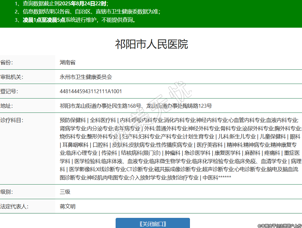 省份:湖南省審批機(jī)關(guān):永州市衛(wèi)生健康委員會(huì)登記號(hào):44814445943112111A1001地址:祁陽(yáng)市龍山街道辦事處民生路168號(hào)、龍山街道辦事處陶鑄路123號(hào)診療科目:預(yù)防保健科 | 全科醫(yī)療科 | 內(nèi)科;呼吸內(nèi)科專(zhuān)業(yè);消化內(nèi)科專(zhuān)業(yè);神經(jīng)內(nèi)科專(zhuān)業(yè);心血管內(nèi)科專(zhuān)業(yè);血液內(nèi)科專(zhuān)業(yè);腎病學(xué)專(zhuān)業(yè);內(nèi)分泌專(zhuān)業(yè);老年病專(zhuān)業(yè) | 外科;普通外科專(zhuān)業(yè);神經(jīng)外科專(zhuān)業(yè);骨科專(zhuān)業(yè);泌尿外科專(zhuān)業(yè);胸外科專(zhuān)業(yè);燒傷科專(zhuān)業(yè);整形外科專(zhuān)業(yè) | 婦產(chǎn)科;婦科專(zhuān)業(yè);產(chǎn)科專(zhuān)業(yè);計(jì)劃生育專(zhuān)業(yè) | 兒科;新生兒專(zhuān)業(yè) | 兒童保健科 | 眼科 | 耳鼻咽喉科 | 口腔科 | 皮膚科;皮膚病專(zhuān)業(yè);性傳播疾病專(zhuān)業(yè) | 醫(yī)療美容科 | 精神科;精神病專(zhuān)業(yè);精神康復(fù)專(zhuān)業(yè);臨床心理專(zhuān)業(yè) | 傳染科 | 結(jié)核病科(限門(mén)診) | 腫瘤科 | 急診醫(yī)學(xué)科 | 康復(fù)醫(yī)學(xué)科 | 麻醉科 | 疼痛科 | 重癥醫(yī)學(xué)科 | 醫(yī)學(xué)檢驗(yàn)科;臨床體液、血液專(zhuān)業(yè);臨床微生物學(xué)專(zhuān)業(yè);臨床化學(xué)檢驗(yàn)專(zhuān)業(yè);臨床免疫、血清學(xué)專(zhuān)業(yè) | 病理科 | 醫(yī)學(xué)影像科;X線(xiàn)診斷專(zhuān)業(yè);CT診斷專(zhuān)業(yè);磁共振成像診斷專(zhuān)業(yè);超聲診斷專(zhuān)業(yè);心電診斷專(zhuān)業(yè);腦電及腦血流圖診斷專(zhuān)業(yè);神經(jīng)肌肉電圖專(zhuān)業(yè);介入放射學(xué)專(zhuān)業(yè);放射治療專(zhuān)業(yè) | 中醫(yī)科******級(jí)別:三級(jí)法定代表人:蔣文明主要負(fù)責(zé)人:蔣文明執(zhí)業(yè)許可證有效期:2022/09/09 -至- 2037/09/09 -