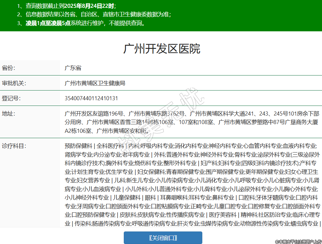 省份:廣東省審批機(jī)關(guān):廣州市黃埔區(qū)衛(wèi)生健康局登記號:354007440112410131地址:廣州開發(fā)區(qū)友誼路196號、廣州市黃埔東路3762號、廣州市黃埔區(qū)科學(xué)大道241、243、245號101房余下部分用房、廣州市黃埔區(qū)香雪三路1號B棟106室、107室和108室、廣州市黃埔區(qū)蘿塱路中87號廣墾商務(wù)大廈A2棟106室、廣州市黃埔區(qū)安和街。診療科目:預(yù)防保健科 | 全科醫(yī)療科 | 內(nèi)科;呼吸內(nèi)科專業(yè);消化內(nèi)科專業(yè);神經(jīng)內(nèi)科專業(yè);心血管內(nèi)科專業(yè);血液內(nèi)科專業(yè);腎病學(xué)專業(yè);內(nèi)分泌專業(yè);老年病專業(yè) | 外科;普通外科專業(yè);神經(jīng)外科專業(yè);骨科專業(yè);泌尿外科專業(yè)(三級泌尿外科內(nèi)鏡診療技術(shù));胸外科專業(yè);燒傷科專業(yè);整形外科專業(yè) | 婦產(chǎn)科;婦科專業(yè)(四級婦科內(nèi)鏡診療技術(shù));產(chǎn)科專業(yè);計劃生育專業(yè);優(yōu)生學(xué)專業(yè) | 婦女保健科;青春期保健專業(yè);圍產(chǎn)期保健專業(yè);更年期保健專業(yè);婦女心理衛(wèi)生專業(yè);婦女營養(yǎng)專業(yè) | 兒科;新生兒專業(yè);小兒傳染病專業(yè);小兒消化專業(yè);小兒呼吸專業(yè);小兒心臟病專業(yè);小兒腎病專業(yè);小兒血液病專業(yè) | 小兒外科;小兒普通外科專業(yè);小兒骨科專業(yè);小兒泌尿外科專業(yè);小兒胸心外科專業(yè);小兒神經(jīng)外科專業(yè) | 兒童保健科 | 眼科 | 耳鼻咽喉科;耳科專業(yè);鼻科專業(yè) | 口腔科;牙體牙髓病專業(yè);口腔內(nèi)科專業(yè);牙周病專業(yè);口腔頜面外科專業(yè);口腔粘膜病專業(yè);正畸專業(yè);兒童口腔專業(yè);口腔修復(fù)專業(yè);口腔頜面外科專業(yè);口腔預(yù)防保健專業(yè) | 皮膚科;皮膚病專業(yè);性傳播疾病專業(yè) | 醫(yī)療美容科 | 精神科;社區(qū)防治專業(yè);臨床心理專業(yè) | 傳染科;腸道傳染病專業(yè);呼吸道傳染病專業(yè);肝炎專業(yè);蟲媒傳染病專業(yè);動物源性傳染病專業(yè);蠕蟲病專業(yè) | 結(jié)核病科 | 地方病科 | 腫瘤科 | 急診醫(yī)學(xué)科 | 康復(fù)醫(yī)學(xué)科 | 運動醫(yī)學(xué)科 | 職業(yè)病科 | 臨終關(guān)懷科 | 麻醉科 | 疼痛科 | 重癥醫(yī)學(xué)科 | 醫(yī)學(xué)檢驗科;臨床體液、血液專業(yè);臨床微生物學(xué)專業(yè);臨床化學(xué)檢驗專業(yè);臨床免疫、血清學(xué)專業(yè);臨床細(xì)胞分子遺傳學(xué)專業(yè) | 病理科 | 醫(yī)學(xué)影像科;X線診斷專業(yè);CT診斷專業(yè);磁共振成像診斷專業(yè);核醫(yī)學(xué)專業(yè);超聲診斷專業(yè);心電診斷專業(yè);腦電及腦血流圖診斷專業(yè);神經(jīng)肌肉電圖專業(yè);介入放射學(xué)專業(yè);放射治療專業(yè) | 中醫(yī)科;內(nèi)科專業(yè);外科專業(yè);婦產(chǎn)科專業(yè);腫瘤科專業(yè);骨傷科專業(yè);肛腸科專業(yè);老年病科專業(yè);針灸科專業(yè);推拿科專業(yè);康復(fù)醫(yī)學(xué)專業(yè);急診科專業(yè);預(yù)防保健科專業(yè) | 中西醫(yī)結(jié)合科******級別:三級法定代表人:陳裕潔主要負(fù)責(zé)人:陳裕潔執(zhí)業(yè)許可證有效期:2024/04/02 -至- 2039/04/01 -