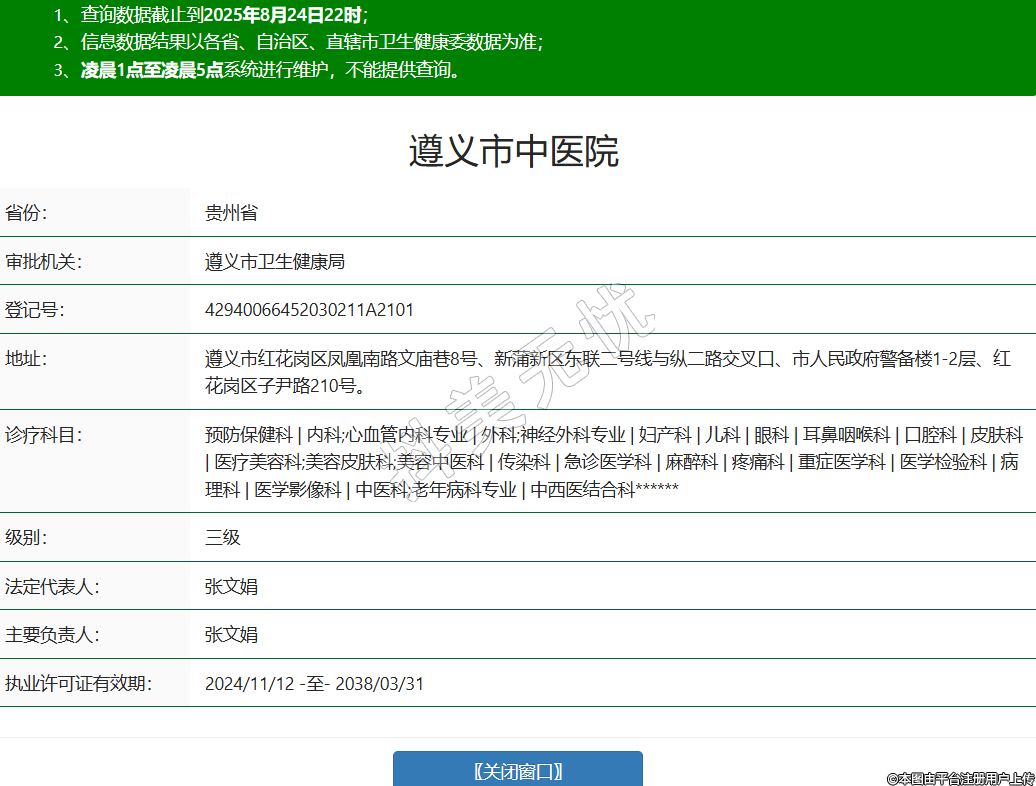 省份:貴州省審批機(jī)關(guān):遵義市衛(wèi)生健康局登記號(hào):42940066452030211A2101地址:遵義市紅花崗區(qū)鳳凰南路文廟巷8號(hào)、新蒲新區(qū)東聯(lián)二號(hào)線與縱二路交叉口、市人民政府警備樓1-2層、紅花崗區(qū)子尹路210號(hào)。診療科目:預(yù)防保健科 | 內(nèi)科;心血管內(nèi)科專業(yè) | 外科;神經(jīng)外科專業(yè) | 婦產(chǎn)科 | 兒科 | 眼科 | 耳鼻咽喉科 | 口腔科 | 皮膚科 | 醫(yī)療美容科;美容皮膚科;美容中醫(yī)科 | 傳染科 | 急診醫(yī)學(xué)科 | 麻醉科 | 疼痛科 | 重癥醫(yī)學(xué)科 | 醫(yī)學(xué)檢驗(yàn)科 | 病理科 | 醫(yī)學(xué)影像科 | 中醫(yī)科;老年病科專業(yè) | 中西醫(yī)結(jié)合科******級(jí)別:三級(jí)法定代表人:張文娟主要負(fù)責(zé)人:張文娟執(zhí)業(yè)許可證有效期:2024/11/12 -至- 2038/03/31 -