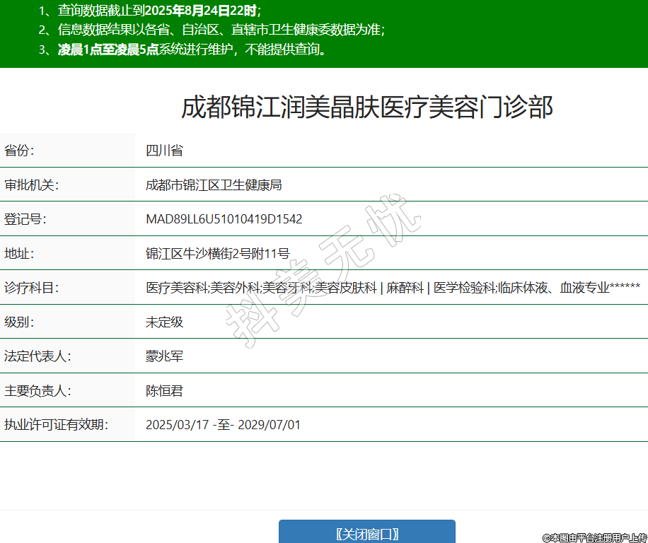 成都錦江潤(rùn)美晶膚醫(yī)療美容門(mén)診部,診療科目:醫(yī)療美容科;美容外科;美容牙科;美容皮膚科 | 麻醉科 | 醫(yī)學(xué)檢驗(yàn)科;臨床體液、血液專(zhuān)業(yè)******