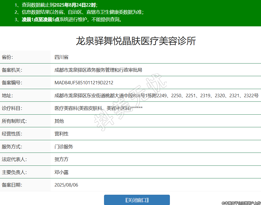 省份:四川省備案機(jī)關(guān):成都市龍泉驛區(qū)政務(wù)服務(wù)管理和行政審批局備案編號(hào):MAD84UF5851011219D2212地址:成都市龍泉驛區(qū)東安街道桃都大道中段888號(hào)1棟附2249、2250、2251、2319、2320、2321、2322號(hào)診療科目:醫(yī)療美容科(美容皮膚科、美容中醫(yī)科)******所有制形式:其他經(jīng)營(yíng)性質(zhì):營(yíng)利性服務(wù)方式:門診服務(wù)法定代表人:賀方方主要負(fù)責(zé)人:鄧小露備案日期:2025/08/06 -