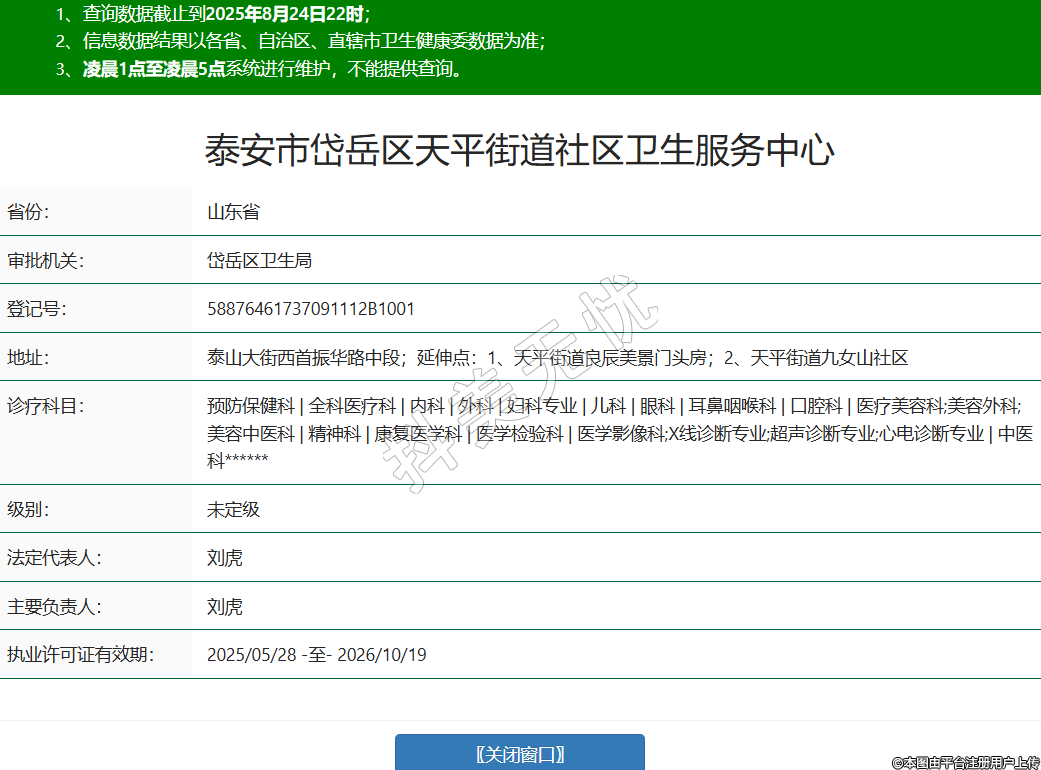省份:山東省審批機關:岱岳區(qū)衛(wèi)生局登記號:58876461737091112B1001地址:泰山大街西首振華路中段;延伸點:1、天平街道良辰美景門頭房;2、天平街道九女山社區(qū)診療科目:預防保健科 | 全科醫(yī)療科 | 內科 | 外科 | 婦科專業(yè) | 兒科 | 眼科 | 耳鼻咽喉科 | 口腔科 | 醫(yī)療美容科;美容外科;美容中醫(yī)科 | 精神科 | 康復醫(yī)學科 | 醫(yī)學檢驗科 | 醫(yī)學影像科;X線診斷專業(yè);超聲診斷專業(yè);心電診斷專業(yè) | 中醫(yī)科******級別:未定級法定代表人:劉虎主要負責人:劉虎執(zhí)業(yè)許可證有效期:2025/05/28 -至- 2026/10/19 -