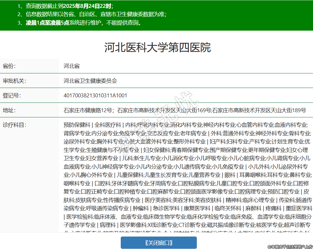 省份:河北省審批機(jī)關(guān):河北省衛(wèi)生健康委員會(huì)登記號(hào):40170038213010311A1001地址:石家莊市健康路12號(hào);石家莊市高新技術(shù)開發(fā)區(qū)天山大街169號(hào);石家莊市高新技術(shù)開發(fā)區(qū)天山大街189號(hào)診療科目:預(yù)防保健科 | 全科醫(yī)療科 | 內(nèi)科;呼吸內(nèi)科專業(yè);消化內(nèi)科專業(yè);神經(jīng)內(nèi)科專業(yè);心血管內(nèi)科專業(yè);血液內(nèi)科專業(yè);腎病學(xué)專業(yè);內(nèi)分泌專業(yè);免疫學(xué)專業(yè);變態(tài)反應(yīng)專業(yè);老年病專業(yè) | 外科;普通外科專業(yè);神經(jīng)外科專業(yè);骨科專業(yè);泌尿外科專業(yè);胸外科專業(yè);心臟大血管外科專業(yè);整形外科專業(yè) | 婦產(chǎn)科;婦科專業(yè);產(chǎn)科專業(yè);計(jì)劃生育專業(yè);優(yōu)生學(xué)專業(yè);生殖健康與不孕癥專業(yè) | 婦女保健科;青春期保健專業(yè);圍產(chǎn)期保健專業(yè);更年期保健專業(yè);婦女心理衛(wèi)生專業(yè);婦女營養(yǎng)專業(yè) | 兒科;新生兒專業(yè);小兒消化專業(yè);小兒呼吸專業(yè);小兒心臟病專業(yè);小兒腎病專業(yè);小兒血液病專業(yè);小兒神經(jīng)病學(xué)專業(yè);小兒內(nèi)分泌專業(yè);小兒遺傳病專業(yè);小兒免疫專業(yè) | 小兒外科;小兒泌尿外科專業(yè);小兒胸心外科專業(yè) | 兒童保健科;兒童生長發(fā)育專業(yè);兒童營養(yǎng)專業(yè) | 眼科 | 耳鼻咽喉科;耳科專業(yè);鼻科專業(yè);咽喉科專業(yè) | 口腔科;牙體牙髓病專業(yè);牙周病專業(yè);口腔粘膜病專業(yè);兒童口腔專業(yè);口腔頜面外科專業(yè);口腔修復(fù)專業(yè);口腔正畸專業(yè);口腔種植專業(yè);口腔麻醉專業(yè);口腔頜面醫(yī)學(xué)影像專業(yè);口腔病理專業(yè);預(yù)防口腔專業(yè) | 皮膚科;皮膚病專業(yè);性傳播疾病專業(yè) | 醫(yī)療美容科;美容牙科;美容皮膚科 | 精神科;臨床心理專業(yè) | 傳染科;腸道傳染病專業(yè);呼吸道傳染病專業(yè) | 腫瘤科 | 急診醫(yī)學(xué)科 | 康復(fù)醫(yī)學(xué)科 | 臨終關(guān)懷科 | 麻醉科 | 疼痛科 | 重癥醫(yī)學(xué)科 | 醫(yī)學(xué)檢驗(yàn)科;臨床體液、血液專業(yè);臨床微生物學(xué)專業(yè);臨床化學(xué)檢驗(yàn)專業(yè);臨床免疫、血清學(xué)專業(yè);臨床細(xì)胞分子遺傳學(xué)專業(yè) | 病理科 | 醫(yī)學(xué)影像科;X線診斷專業(yè);CT診斷專業(yè);磁共振成像診斷專業(yè);核醫(yī)學(xué)專業(yè);超聲診斷專業(yè);心電診斷專業(yè);腦電及腦血流圖診斷專業(yè);介入放射學(xué)專業(yè);放射治療專業(yè) | 中醫(yī)科;內(nèi)科專業(yè);腫瘤科專業(yè);針灸科專業(yè);推拿科專業(yè);康復(fù)醫(yī)學(xué)專業(yè)******級(jí)別:三級(jí)法定代表人:趙宗茂主要負(fù)責(zé)人:執(zhí)業(yè)許可證有效期:2025/03/11 -至- 2029/10/26 -